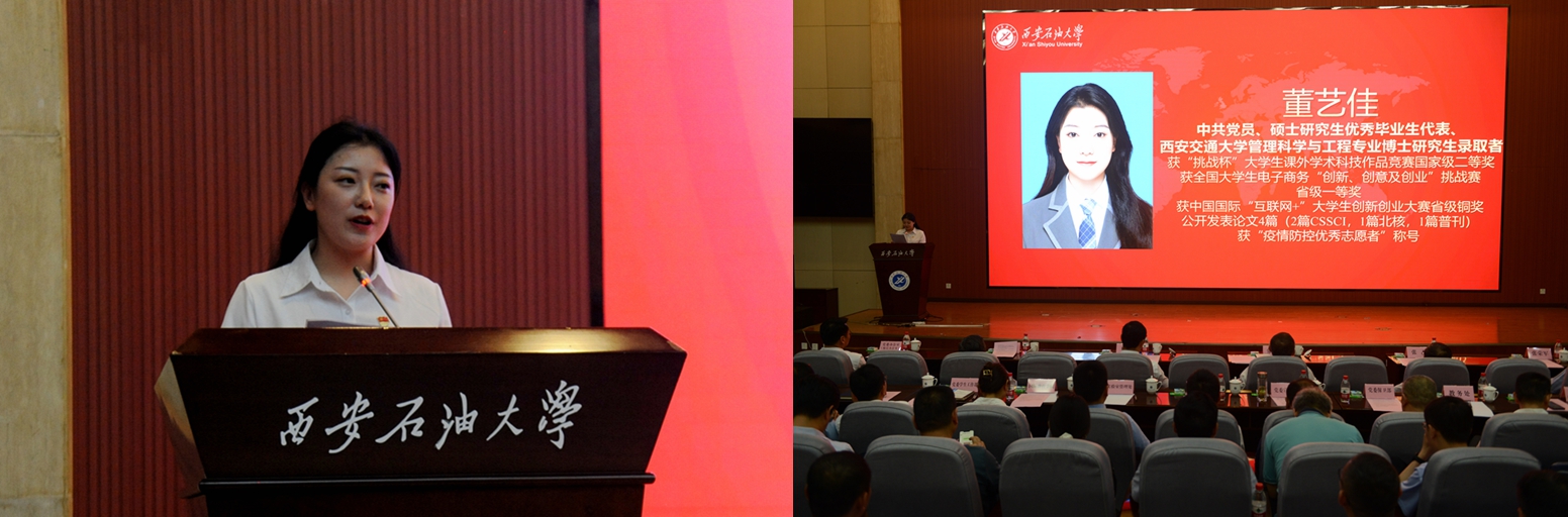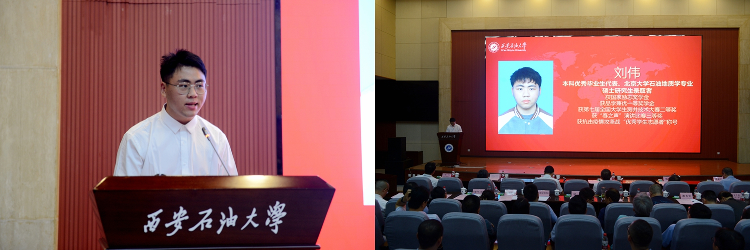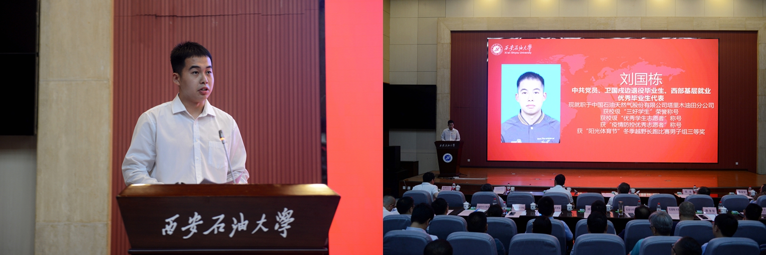 中共黨員、陜西省大學生自強之星、陜西好青年榮譽稱號獲得者,石油工程學院學生梁歡;本科優(yōu)秀畢業(yè)生代表、北京大學石油地質(zhì)學專業(yè)碩士研究生錄取者,地球科學與工程學院學生劉偉;國際學生本科優(yōu)秀畢業(yè)生代表、哈薩克斯坦籍留學生,國際教育學院學生亞歷山大;中共黨員、碩士研究生優(yōu)秀畢業(yè)生代表、西安交通大學管理科學與工程專業(yè)博士研究生錄取者,經(jīng)濟管理學院學生董藝佳;中共黨員、衛(wèi)國戍邊退役畢業(yè)生代表、西部基層就業(yè)優(yōu)秀畢業(yè)生代表,石油工程學院學生劉國棟分別作了交流發(fā)言。