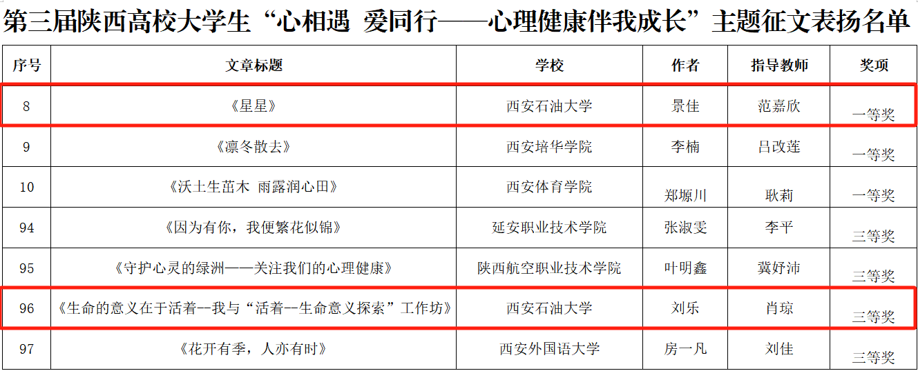 其中,在第九屆陜西高校心理健康教育指導(dǎo)典型案例比賽中,我校學(xué)生工作部(處)(學(xué)生心理成長(zhǎng)指導(dǎo)中心)(以下簡(jiǎn)稱“心理中心”)焦文潔、趙晶兩位老師分別榮獲一等獎(jiǎng)和二等獎(jiǎng);在第三屆陜西高校學(xué)生心理健康教育課程教學(xué)展示活動(dòng)中,心理中心魏曉言老師榮獲“教學(xué)骨干”稱號(hào);在第三屆陜西高校大學(xué)生“心相遇愛同行——心理健康伴我成長(zhǎng)”主題征文活動(dòng)中,范嘉欣老師指導(dǎo)學(xué)生景佳的作品《星星》獲得一等獎(jiǎng),心理中心肖瓊老師指導(dǎo)學(xué)生劉樂的作品《生命的意義在于活著—我與“活著—生命意義探索”工作坊》獲三等獎(jiǎng)。