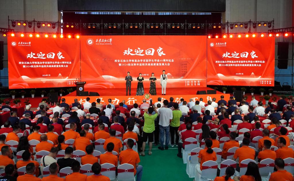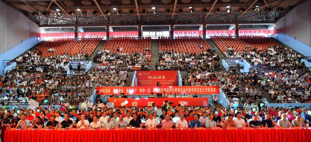 7月27日上午,學(xué)校在雁塔校區(qū)體育館隆重舉行了恢復(fù)辦學(xué)首屆學(xué)生畢業(yè)40周年紀(jì)念暨2024校友秩年返校共商高質(zhì)量發(fā)展大會。學(xué)校黨政領(lǐng)導(dǎo)常江、王進富、張木、王輝強、程永清、楊戰(zhàn)社、張榮軍、張君濤、張驍勇、趙健、樊曉民出席會議,校友代表、校友家屬、各地校友分會負責(zé)人代表、校友企業(yè)家聯(lián)合會代表、歷任校領(lǐng)導(dǎo)代表,各職能部門和院(系)負責(zé)人、教師代表和在校生代表共計1200余人參加會議。