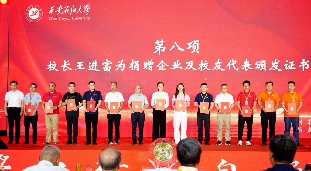王進富為本次秩年返?;顒泳杩罹栉锏男S汛怼嗉壌砗推髽I(yè)代表頒發(fā)了捐贈證書,感謝他們對學(xué)校建設(shè)和發(fā)展的貢獻。