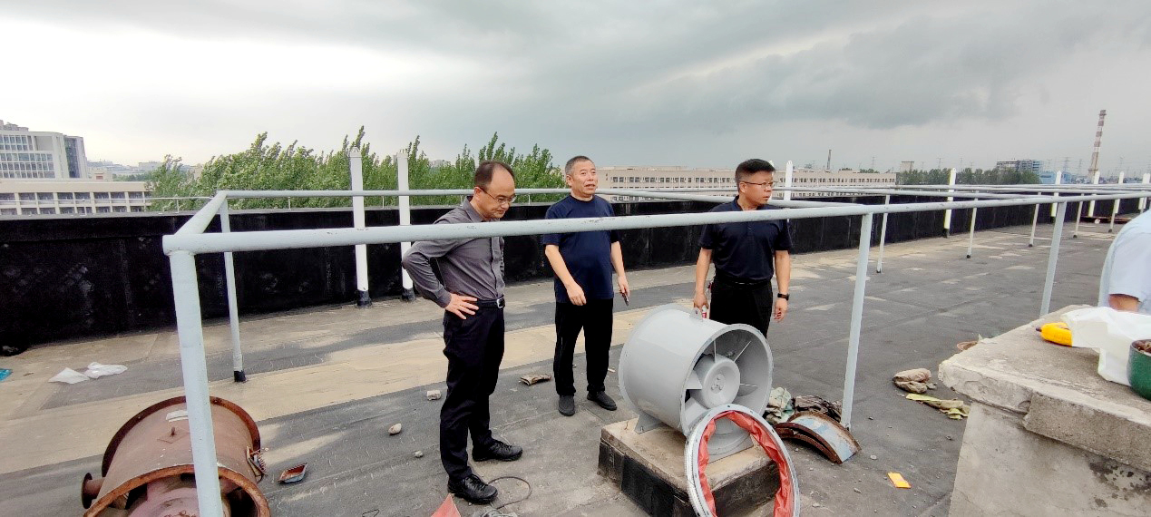 在12號學生宿舍樓頂——消防專項行動學生宿舍整改項目施工現(xiàn)場,張驍勇、趙健詳細了解樓頂消防排風軸流風機的更換進展情況和室內煙感更新維護進度安排,強調要嚴格對照消防標準,加快施工進度,保證工程質量,確保盡快完成整改任務。