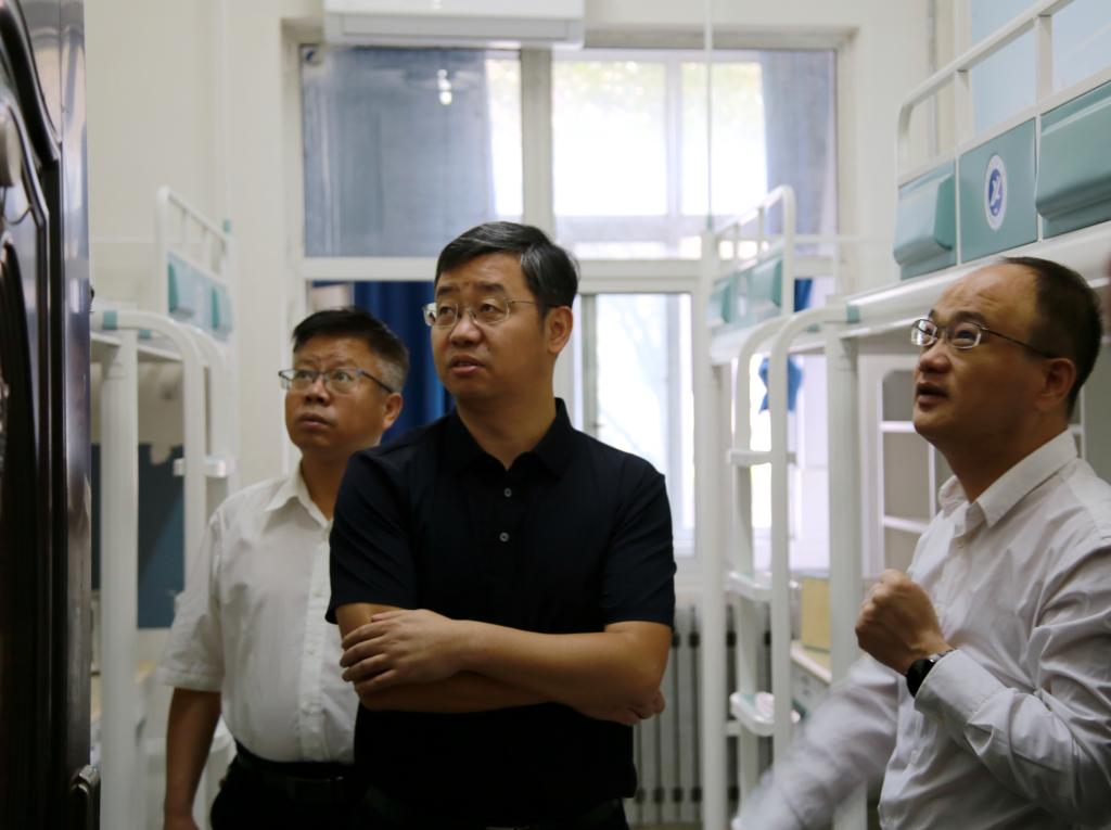 王進(jìn)富帶隊走進(jìn)東區(qū)15號和16號新生宿舍樓,聽取了后勤處負(fù)責(zé)同志關(guān)于新生宿舍準(zhǔn)備工作的匯報。在檢查中他強調(diào),宿舍的環(huán)境直接會影響到學(xué)生的學(xué)習(xí)和生活質(zhì)量,后勤處等相關(guān)部門必須全力以赴為學(xué)生提供一個安全、舒適、衛(wèi)生、便利的居住環(huán)境。檢查中,王進(jìn)富和宿舍樓前偶遇的新生及家長進(jìn)行了親切交談,并合影留念。