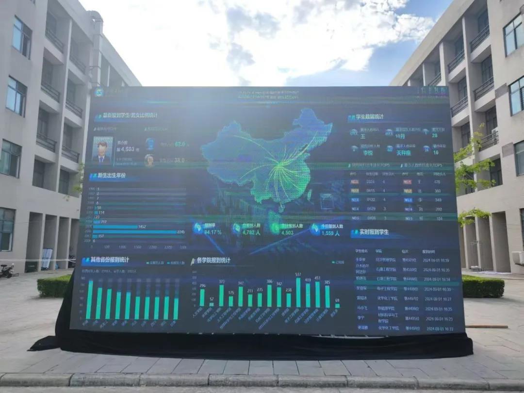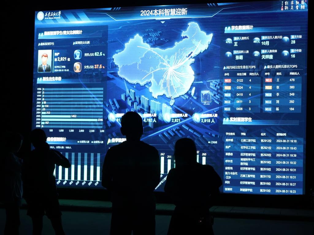 迎新現(xiàn)場設(shè)立了網(wǎng)絡(luò)可視化大數(shù)據(jù)電子屏幕,實時呈現(xiàn)全校本科新生報到情況,包含學生基本信息、所在省份,及有多少人與該名同學來自相同的省份、高中、相同的生日、姓氏、名字等有趣的信息,直觀展現(xiàn)出新生從祖國各地匯聚到西安石油大學的震撼場面。