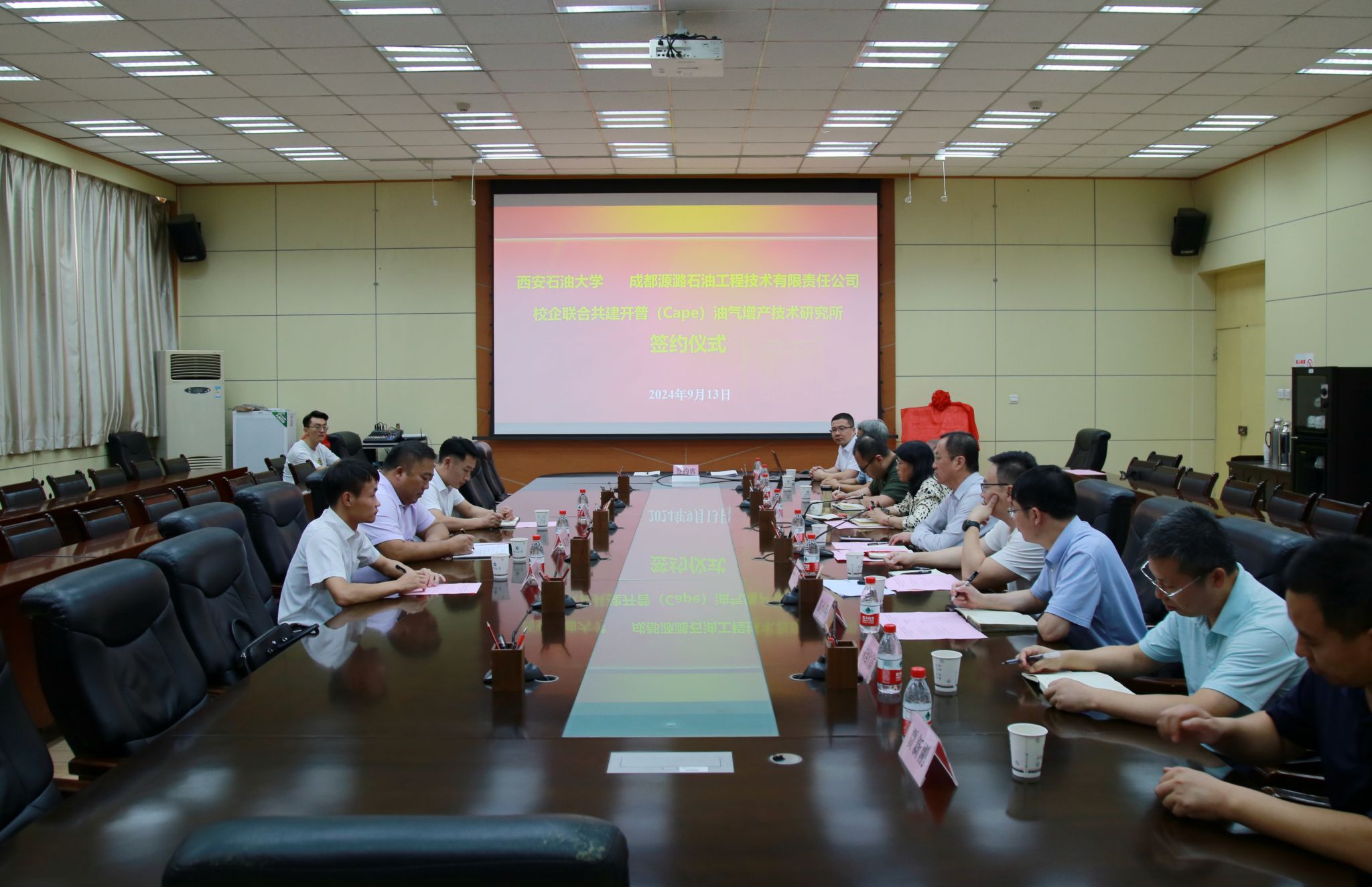 9月13日上午,西安石油大學與成都源潞石油工程技術有限責任公司校企聯(lián)合共建開普(Cape)油氣增產(chǎn)技術研究所簽約儀式在學校雁塔校區(qū)會議中心第一會議室舉行,副校長張榮軍出席簽約儀式,成都源潞石油工程技術有限責任公司總經(jīng)理陳造峰及有關部門負責人,科研處副處長屈樂,化學化工學院領導班子成員、各系主任、分析檢測中心主任參加儀式。