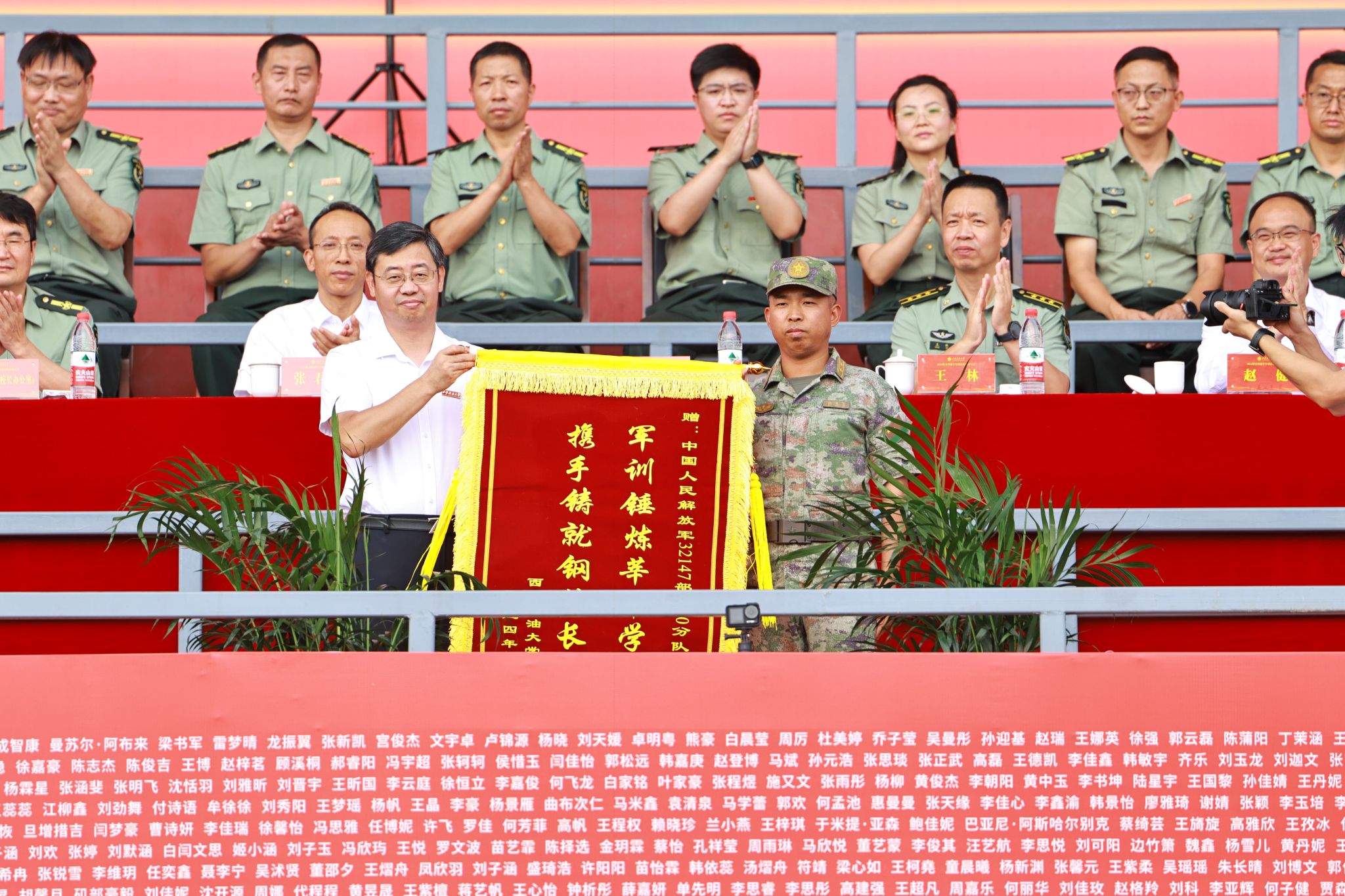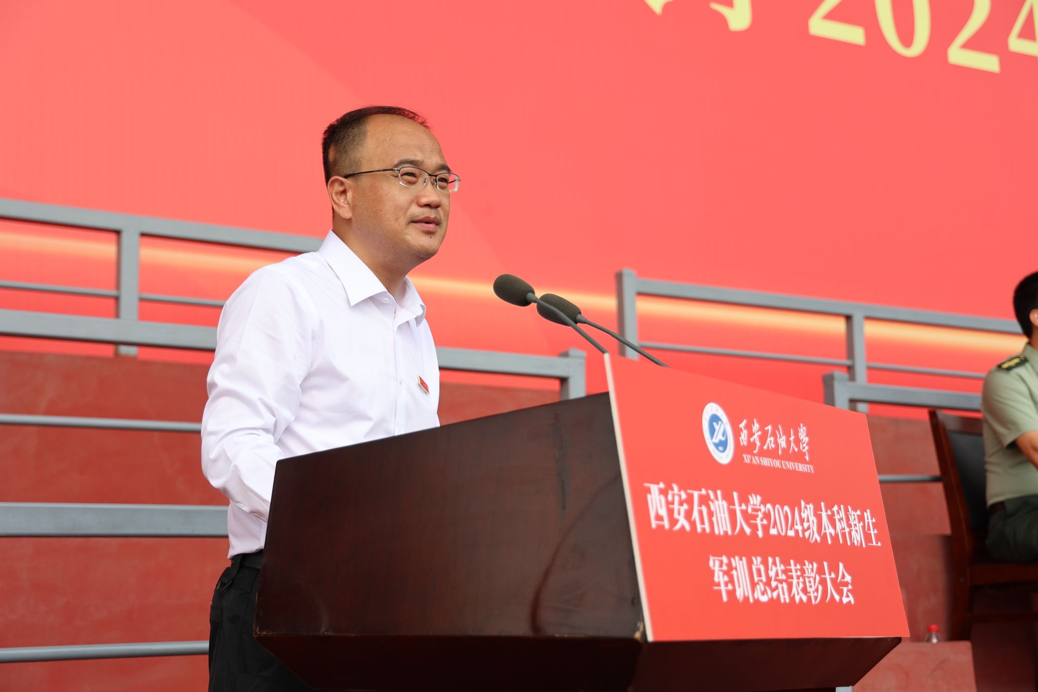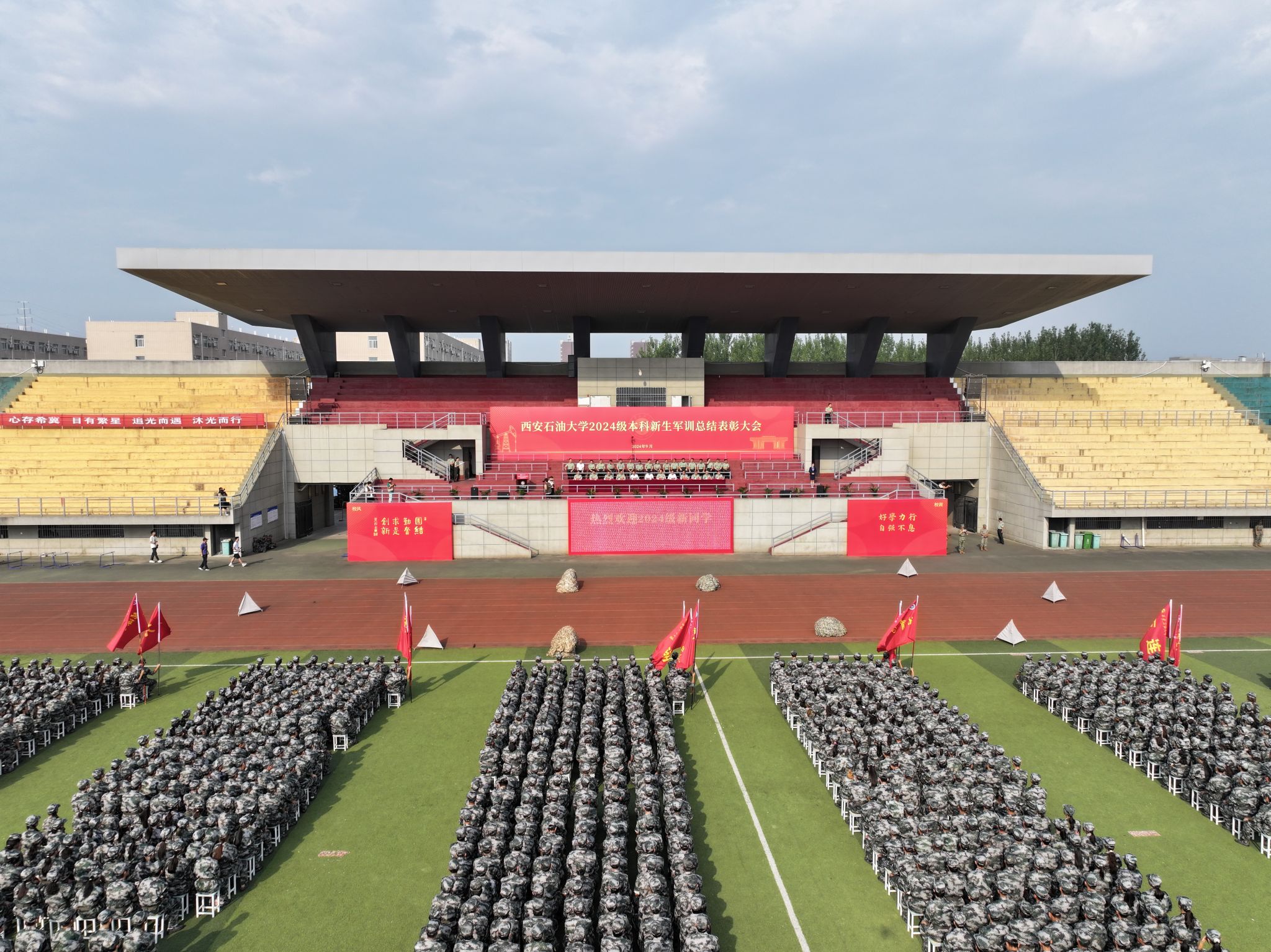 9月15日上午,我校2024級本科新生軍訓(xùn)總結(jié)表彰大會在鄠邑校區(qū)東田徑場舉行。校長王進(jìn)富、副校長張君濤、副校長趙健,中國人民解放軍某部王林上校出席大會。軍訓(xùn)領(lǐng)導(dǎo)小組成員單位負(fù)責(zé)人,全體參訓(xùn)干部、全體教官及2024級全體本科生共4800余人參加大會。大會由軍訓(xùn)旅政委、武裝部部長王亮主持。