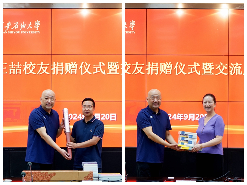 張木向王喆頒發(fā)捐贈證書和校史。他強調(diào),學(xué)生是學(xué)校的中心,教師是學(xué)校的主體,校友則始終是學(xué)校的寶貴力量。學(xué)校重視校友工作,加強構(gòu)建校友工作體系,推動校友工作專業(yè)化、精細(xì)化發(fā)展,加快建設(shè)校友與母校情感共同體、事業(yè)共同體、命運共同體。希望全體西石大人凝心聚力,共同奮斗,為母校多爭榮譽,為國家多做貢獻(xiàn)。