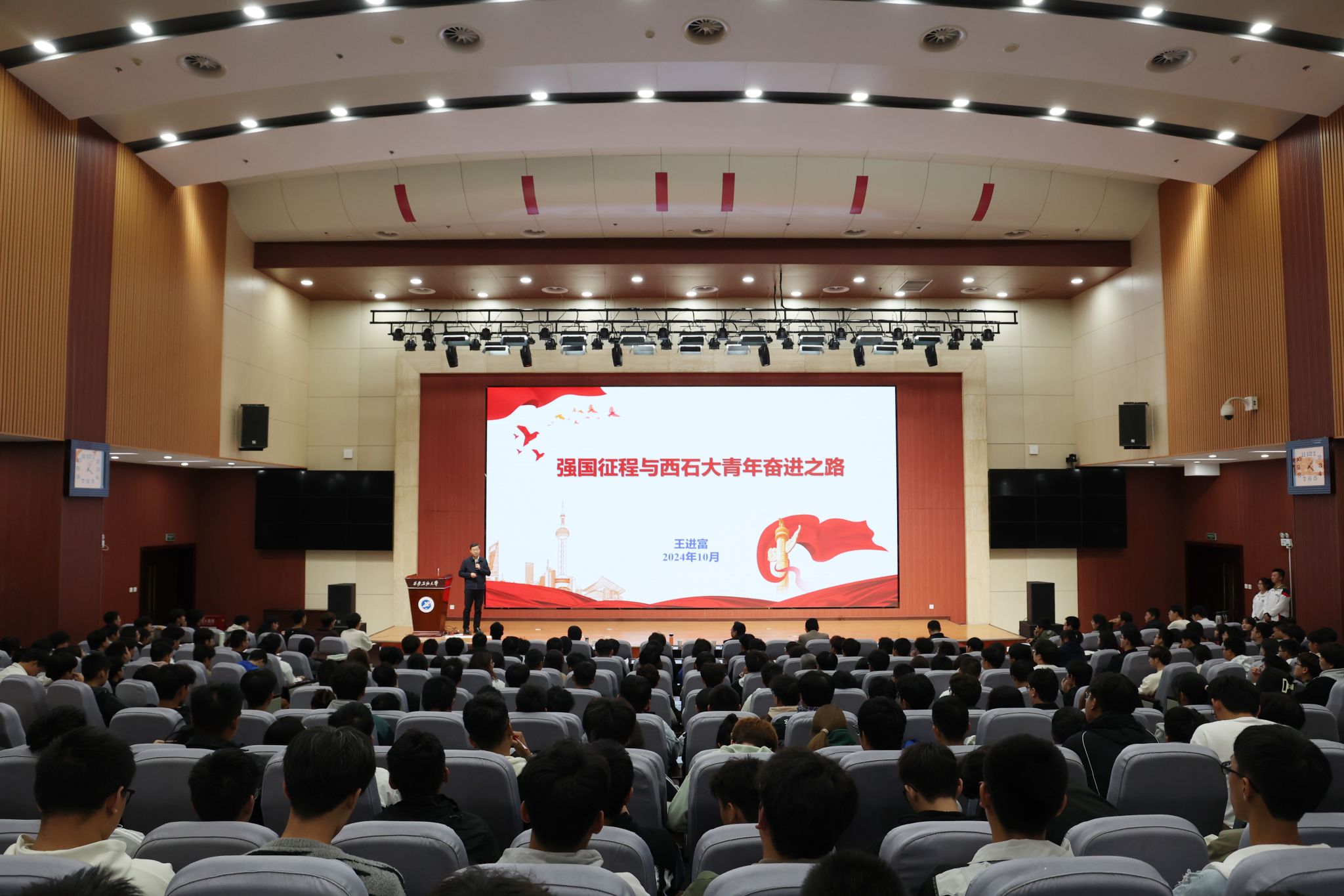 在授課中,王進(jìn)富首先圍繞“新時(shí)代是什么樣的時(shí)代”,向同學(xué)們講授了新時(shí)代“新”在何處,深刻闡釋了中國特色社會主義進(jìn)入新時(shí)代是我國發(fā)展新的歷史方位。他結(jié)合1989-2022年中國經(jīng)濟(jì)GDP同比增速數(shù)據(jù)、人工智能時(shí)代的到來等實(shí)例,引導(dǎo)師生認(rèn)真思考為什么要建設(shè)社會主義現(xiàn)代化強(qiáng)國以及強(qiáng)國征程如何實(shí)現(xiàn)。隨后,他從實(shí)現(xiàn)強(qiáng)國征程要深刻認(rèn)識和把握黨百年奮斗的初心使命入手,闡述了“中國夢”的內(nèi)涵、重要意義及實(shí)現(xiàn)路徑,引領(lǐng)廣大青年從黨的百年歷史中汲取智慧和力量,在接續(xù)奮斗中踐行“請黨放心,強(qiáng)國有我”的錚錚誓言。接著,他細(xì)致講解了中國式現(xiàn)代化的圖景與發(fā)展邏輯、中國式現(xiàn)代化的主要特征及其內(nèi)涵、新質(zhì)生產(chǎn)力的科學(xué)內(nèi)涵與發(fā)展路徑等內(nèi)容,深刻闡釋了以中國式現(xiàn)代化全面推進(jìn)強(qiáng)國建設(shè)、民族復(fù)興和以新質(zhì)生產(chǎn)力發(fā)展推進(jìn)中國式現(xiàn)代化建設(shè)的重要意義。他指出,推動新質(zhì)生產(chǎn)力發(fā)展離不開教育、科技、人才的支撐,鼓勵(lì)學(xué)生要努力奮斗,立志成長為行業(yè)精英,為國家油氣勘探開發(fā)提供更前沿、更先進(jìn)的技術(shù)。最后,他深入分析了科技創(chuàng)新面臨的嚴(yán)峻挑戰(zhàn)、產(chǎn)業(yè)安全面臨的重大風(fēng)險(xiǎn)、大學(xué)正在遭遇深度困境、人才培養(yǎng)亟待深刻變革、快速持續(xù)的變化與傳統(tǒng)體系的矛盾凸顯、未來的人才需求與現(xiàn)實(shí)教育模式錯(cuò)位六個(gè)方面,強(qiáng)調(diào)大學(xué)使命是要深入解決“卡脖子”問題,支撐中國式現(xiàn)代化亟需培養(yǎng)拔尖創(chuàng)新人才、卓越工程師。他勉勵(lì)青年學(xué)生一是要有胸懷天下的眼界,培養(yǎng)正確的世界觀、人生觀、價(jià)值觀,堅(jiān)持“共性基礎(chǔ)+個(gè)性發(fā)展”,不斷培養(yǎng)洞察未來、引領(lǐng)未來的能力和素質(zhì);二是要注重知識體系重塑、工程思維涵養(yǎng)、工程能力再構(gòu),鼓勵(lì)學(xué)生從土狼、牛、鸚鵡、蜘蛛等動物身上,學(xué)習(xí)它們永不放棄、吃苦耐勞、堅(jiān)忍不拔、良好的語言溝通、織網(wǎng)精神等優(yōu)秀的品質(zhì),不斷培養(yǎng)應(yīng)對挑戰(zhàn)、解決問題的能力和素養(yǎng);三是要心懷夢想,擁有一顆不動搖的冠軍的心,要學(xué)習(xí)鐵人王進(jìn)喜“有條件要上,沒有條件創(chuàng)造條件也要上”的精神,迎難而上,勇往直前,不斷培養(yǎng)勇于創(chuàng)新、終身發(fā)展的意識和能力。希望同學(xué)們?yōu)橛蜌庠鰞ι袭a(chǎn)而努力奮斗,期待同學(xué)們成長成才,不負(fù)韶華,為強(qiáng)國建設(shè)貢獻(xiàn)青春力量。