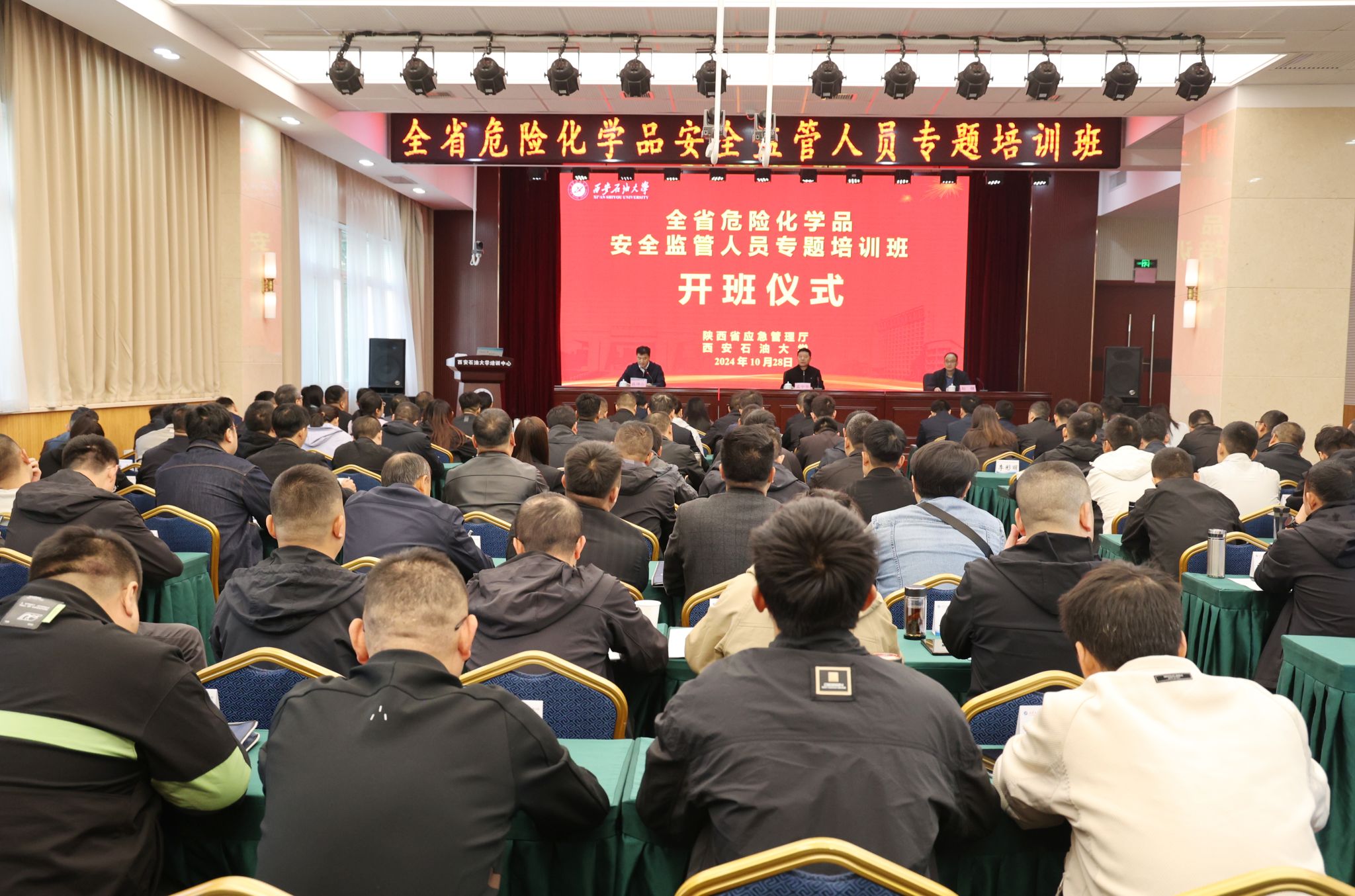 為進一步提升我省危險化學品監(jiān)管人員安全監(jiān)管水平,有效遏制危險化學品領(lǐng)域安全事故,10月28日上午,由省應(yīng)急管理廳主辦、西安石油大學培訓中心承辦的全省危險化學品安全監(jiān)管人員培訓班在西安石油大學明德校區(qū)順利開班。省應(yīng)急管理廳黨委副書記孟中華,我校黨委委員、副校長趙健及來自全省12個市(區(qū))、危險化學品重點縣(區(qū))和29個化工園區(qū)的120名安全監(jiān)管人員出席開班儀式,儀式由省應(yīng)急管理廳?;幪庨L陳坤山主持。