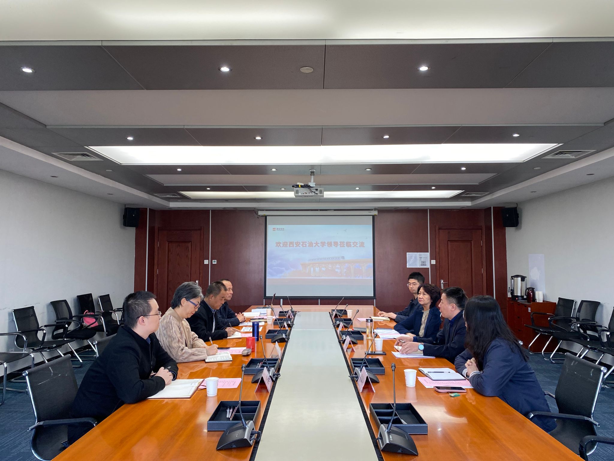 陳紅對程永清一行來訪表示熱烈歡迎,并介紹了公司的基本概況、主營業(yè)務和企業(yè)文化建設情況。她表示,今年6月校企雙方已在“城市記憶·地鐵遇見畢業(yè)季”大學生畢業(yè)作品展活動中建立了深厚的合作基礎,活動反響熱烈,石油學子的藝術節(jié)目和專業(yè)作品令人印象深刻。她強調,西安軌道交通集團歷來重視與西安高校合作,其中以地鐵為平臺、依托文化長廊,聯(lián)合高校展示科技創(chuàng)新和文化特色是近年新穎的策展方式,讓市民游客在穿梭的地鐵中可以感受城市歷史文化底蘊,有著獨特的策展思路和優(yōu)勢。西安石油大學辦學特色鮮明,始終堅持服務國家能源戰(zhàn)略需求和陜西經濟社會發(fā)展,取得了一系列引人注目的發(fā)展成就,集團將全力支持本次合作,希望雙方借此機會能進一步加強文化交流、合力打造具有城市特色的文化品牌矩陣,為全省加快構建支撐有力的文化建設體系、推進文化自信自強提供有力支撐。