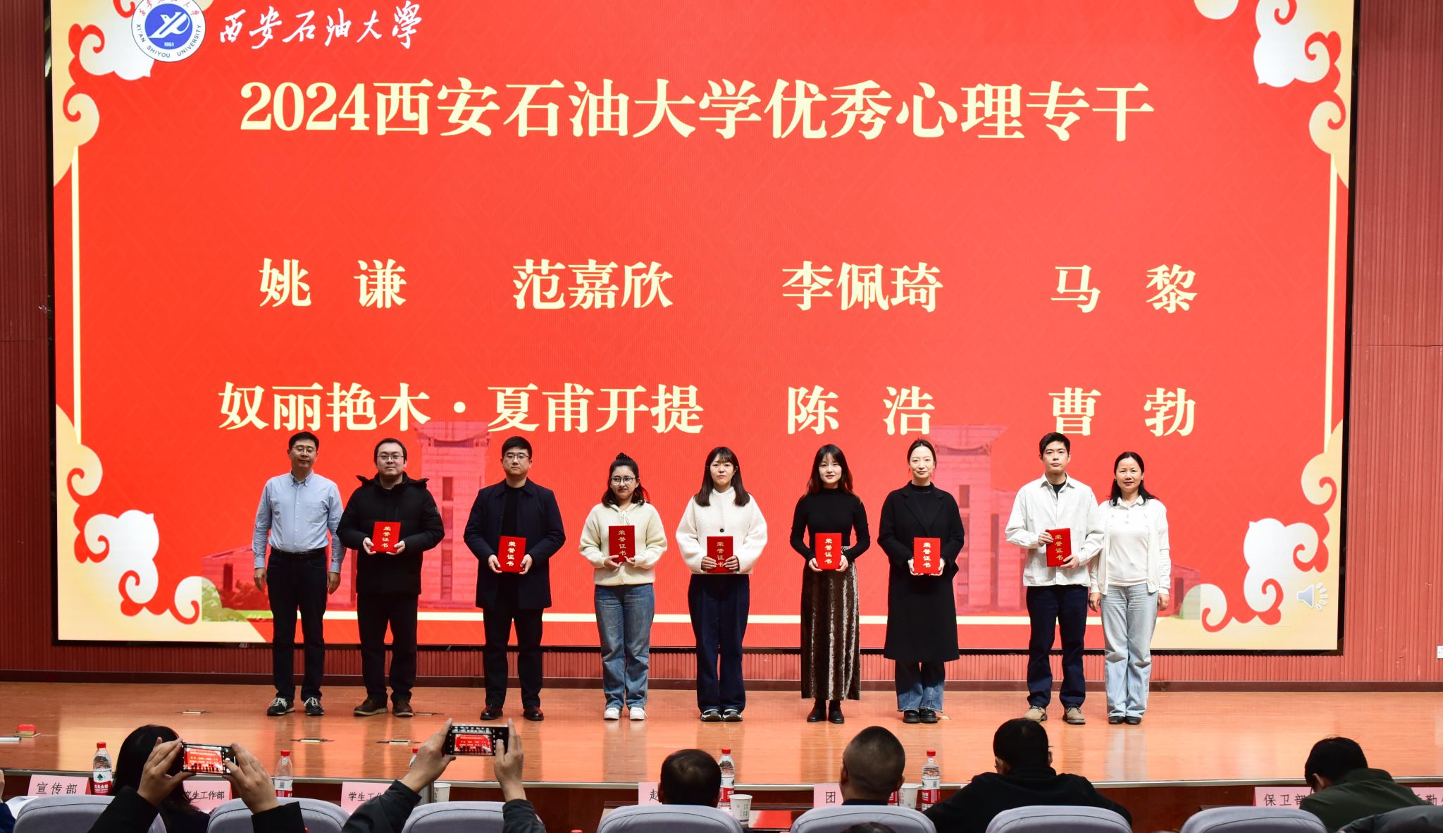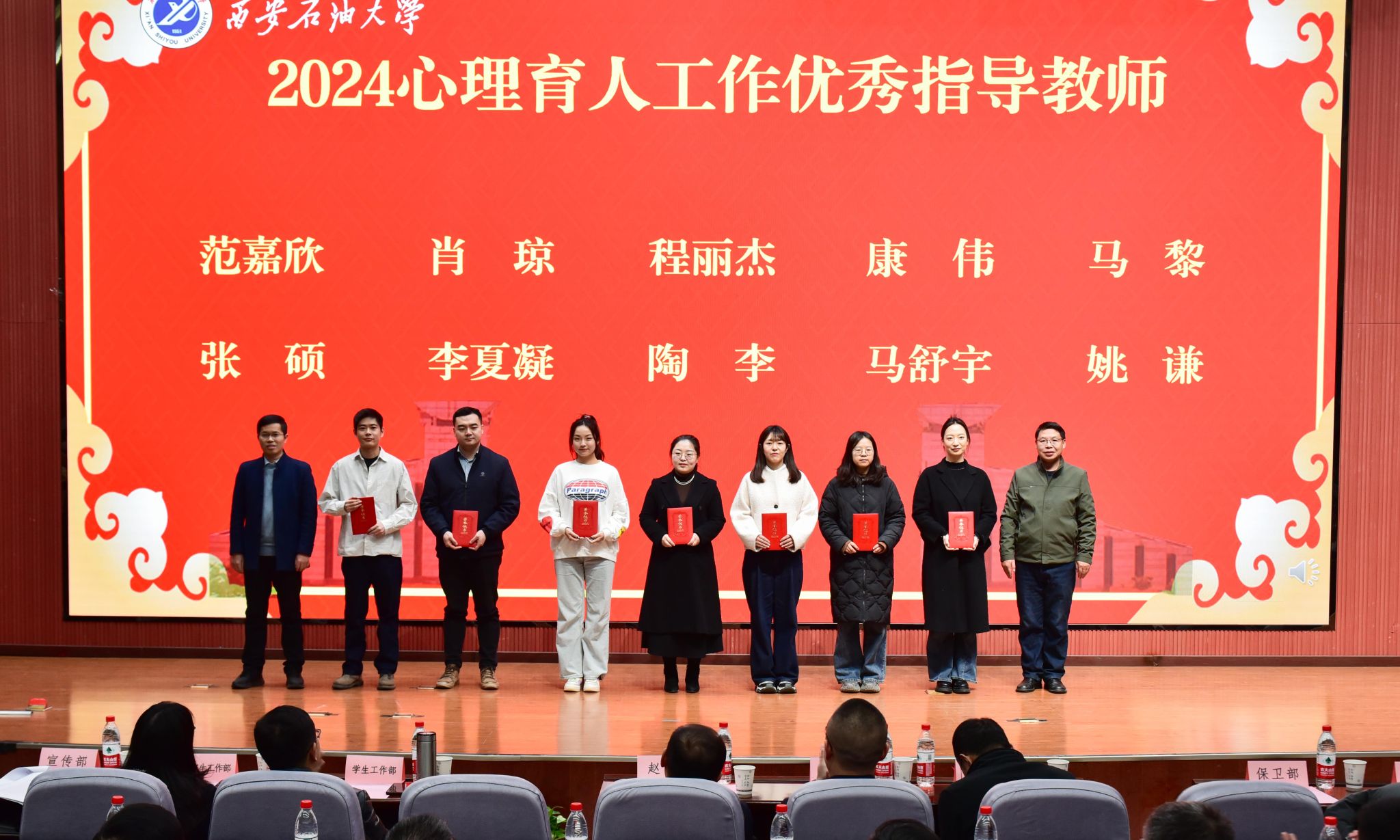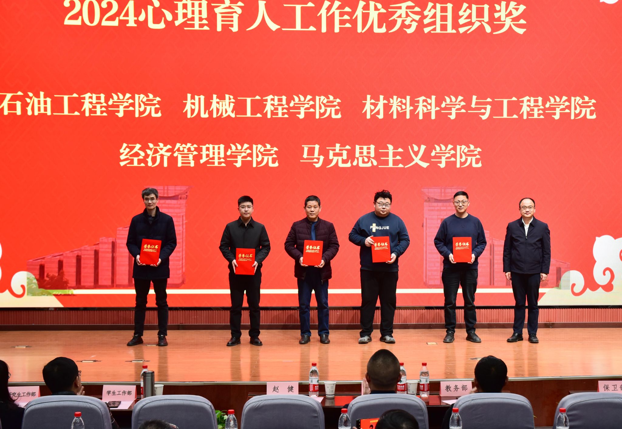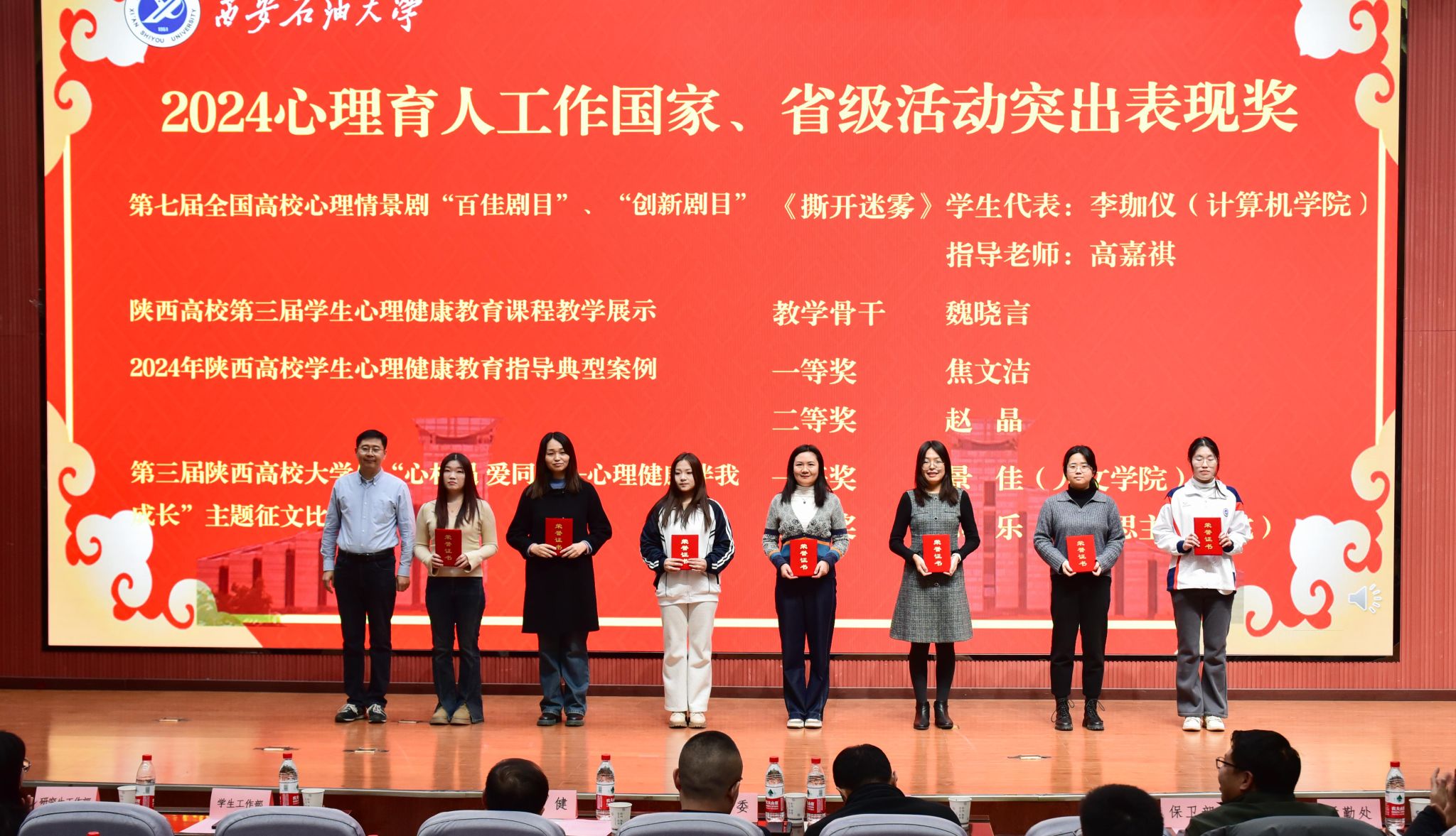 學(xué)生工作部部長王亮宣讀了我校師生在2024年國家、省級心理健康教育工作中的獲獎情況以及《關(guān)于西安石油大學(xué)2024心理育人工作先進(jìn)單位和個人的表彰決定》。與會領(lǐng)導(dǎo)為獲獎個人及集體頒獎。