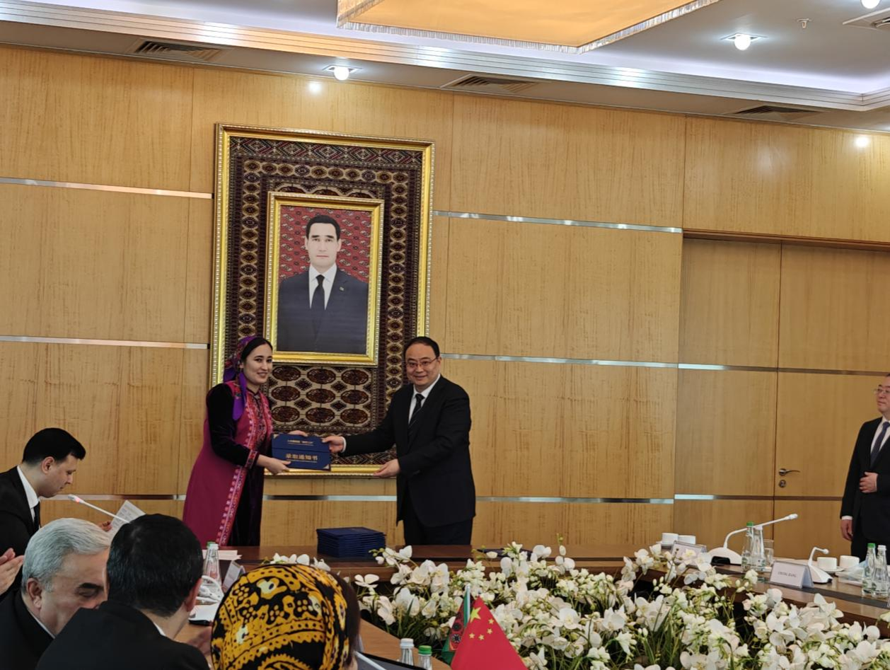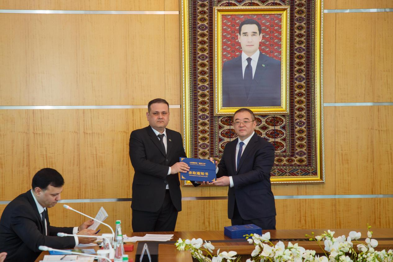 王樹聲和常江代表土庫曼斯坦“魯班工坊”中方共建單位為卡卡耶夫國際油氣大學(xué)20名參培教師頒發(fā)師資培訓(xùn)錄取通知書。