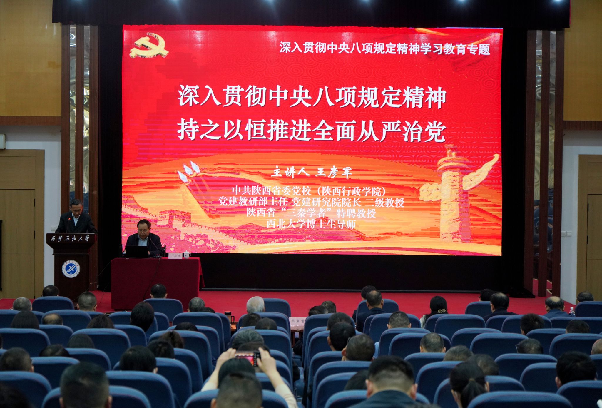 為進(jìn)一步學(xué)深悟透中央八項(xiàng)規(guī)定精神,4月10日上午,學(xué)校舉行深入貫徹中央八項(xiàng)規(guī)定精神學(xué)習(xí)教育讀書(shū)班第二場(chǎng)專(zhuān)題輔導(dǎo)報(bào)告會(huì),中共陜西省委黨校(陜西行政學(xué)院)黨建教研部主任、黨建研究院院長(zhǎng)、二級(jí)教授王彥軍受邀作專(zhuān)題輔導(dǎo)。會(huì)前,校黨委副書(shū)記、校長(zhǎng)王進(jìn)富,校黨委副書(shū)記張木,校黨委委員、組織部部長(zhǎng)種宇宏與王彥軍教授作了交流。輔導(dǎo)報(bào)告會(huì)由張木主持。