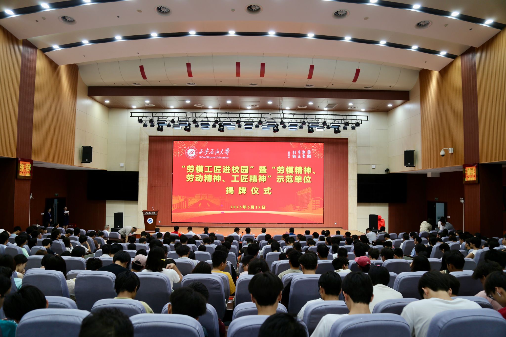 5月19日下午,我校在鄠邑校區(qū)圖書(shū)館弘石學(xué)術(shù)報(bào)告廳舉行“勞模工匠進(jìn)校園”暨“勞模精神、勞動(dòng)精神、工匠精神”示范單位揭牌儀式。陜西省勞模工匠協(xié)會(huì)會(huì)長(zhǎng)蘭新哲,副會(huì)長(zhǎng)張向陽(yáng)、石軍利,延長(zhǎng)油田股份有限公司工會(huì)副主席崔完生,勞模工匠代表:延長(zhǎng)油田志丹采油廠(chǎng)黨委書(shū)記薛濤、吳起采油廠(chǎng)油田工程作業(yè)大隊(duì)事故井處理崗工段長(zhǎng)張發(fā)珠,我校校長(zhǎng)王進(jìn)富出席儀式。儀式由我校黨委委員、副校長(zhǎng)張驍勇主持。