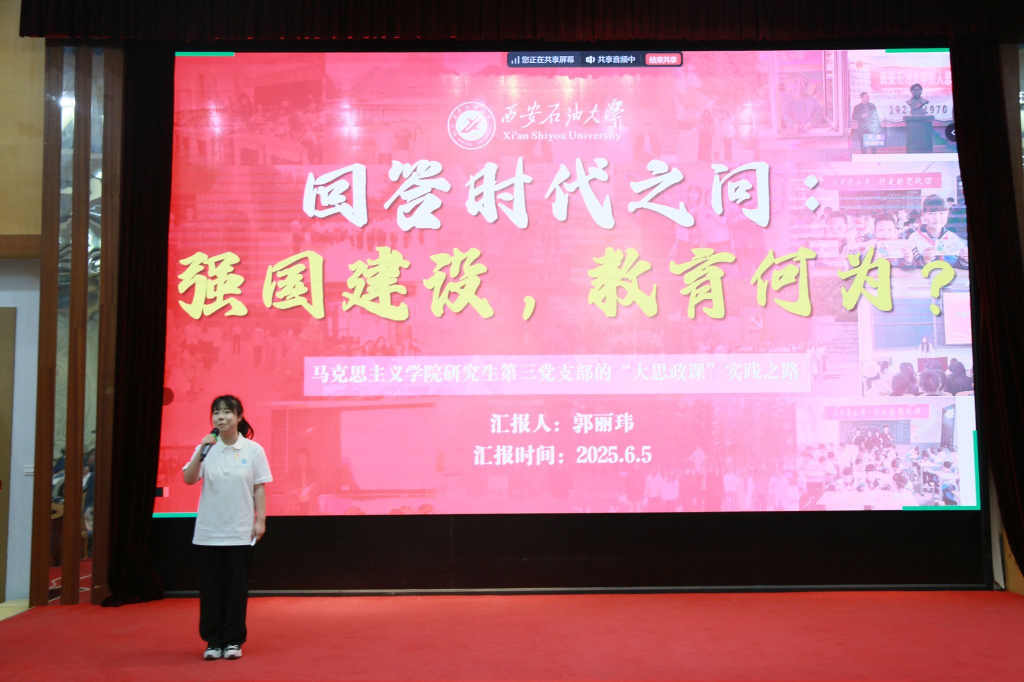 在十佳研究生黨員風采展示中,石油工程學院博士研究生陳浩宇講述了以“融山匯?!敝聚`行能源報國初心,將九年志愿服務與六年黨務工作融入科研探索,發(fā)表8篇SCI論文和多項科研項目,以1150小時志愿服務踐行初心,以山海之志鑄就能源報國的新篇。經濟管理學院碩士研究生姬祥飛講述了在西石大七年求學中,勤于實踐,漫漫求索,獲學生骨干、學術科研、學科競賽等多項成果,曾獲三次國家獎學金,榮獲“陜西好青年”,彰顯新時代青年擔當?shù)墓适隆C械工程學院碩士研究生李紀新,以“紀實青春支教路,心繪未來新篇章”為主題分享了他的支教經歷和感悟,展現(xiàn)了以青春之小我融入祖國之大我,在未來學術挑戰(zhàn)中奮勇向前的信心和決心。電子工程學院碩士研究生熊澤康以“小電路大擔當:一名工科黨員的能源報國路”為題,講述了以紅色信仰鑄就科研報國志,在團隊科研項目中實現(xiàn)國產化突破,抒發(fā)了石油學子以電路為刃破解能源困局,以青春擔當鑄牢國家能源安全防線的青春志向。