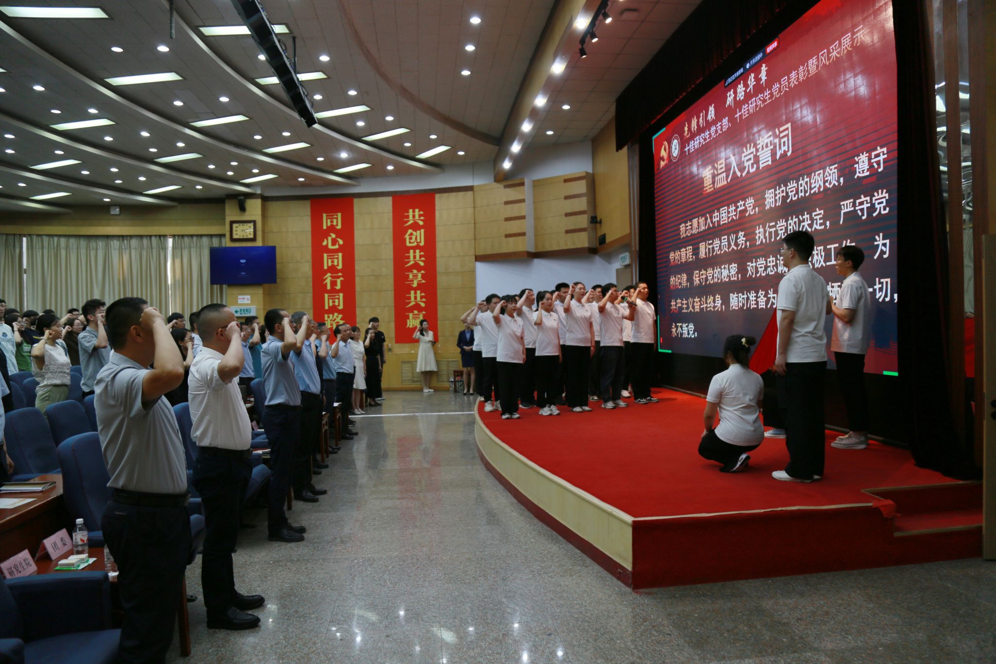 展示結束后,現(xiàn)場全體黨員在“雙十佳”研究生黨員的帶領下重溫入黨誓詞。大家舉起右拳,莊嚴宣誓,再一次用入黨誓詞洗滌心靈,激發(fā)為共產主義奮斗終生的昂揚精神。