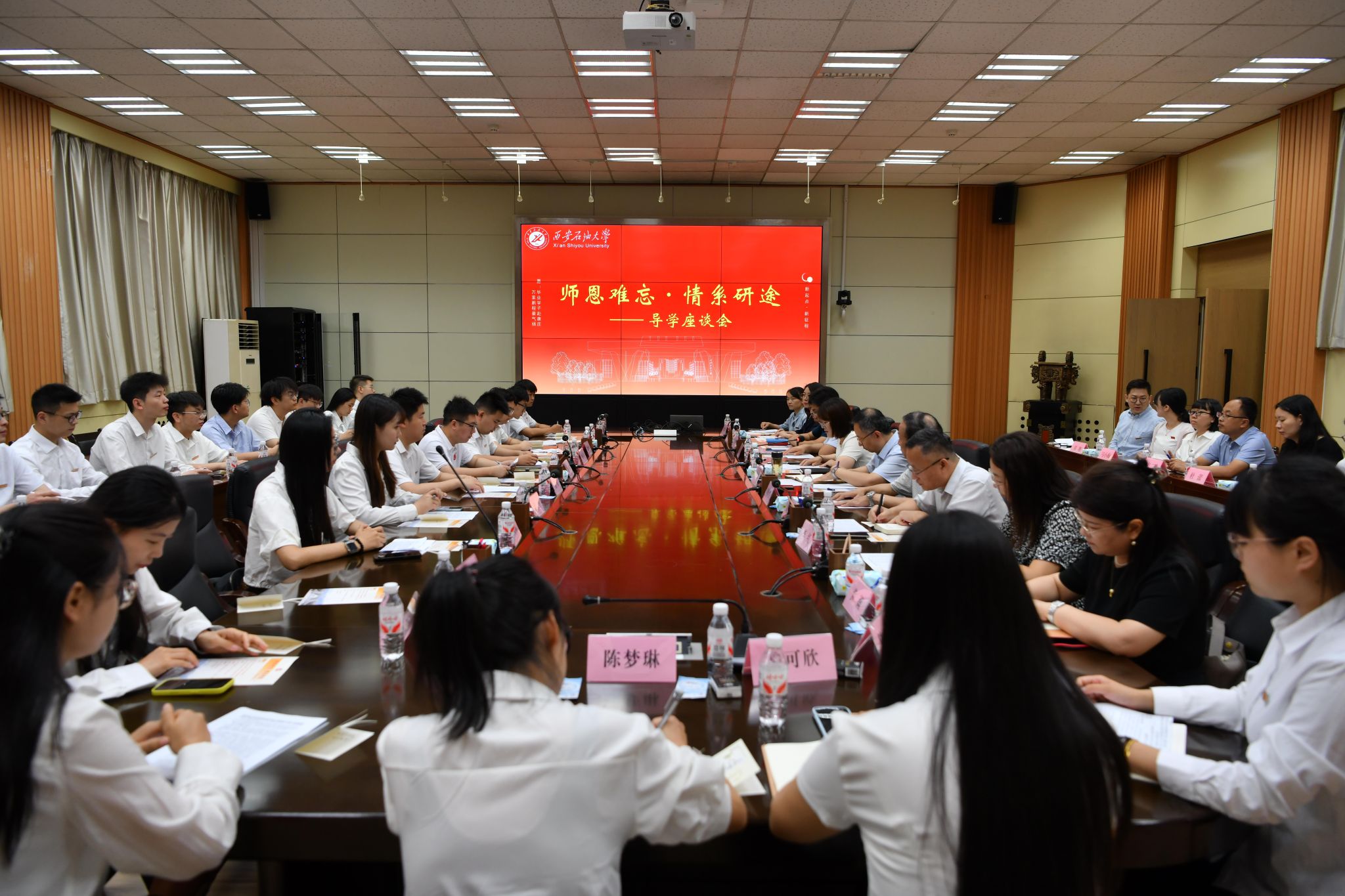 6月18日上午,“師恩難忘·情系研途”導(dǎo)學(xué)座談會(huì)在雁塔校區(qū)第二會(huì)議室舉行。副校長種宇宏,導(dǎo)師代表校學(xué)術(shù)委員會(huì)主任委員石油工程學(xué)院周德勝、新能源學(xué)院院長宋海洋、化學(xué)化工學(xué)院李紅、理學(xué)院丁繼軍、經(jīng)濟(jì)管理學(xué)院黃莉,研究生工作部、研究生院負(fù)責(zé)人以及全體畢業(yè)班研究生輔導(dǎo)員、畢業(yè)研究生代表參加會(huì)議。