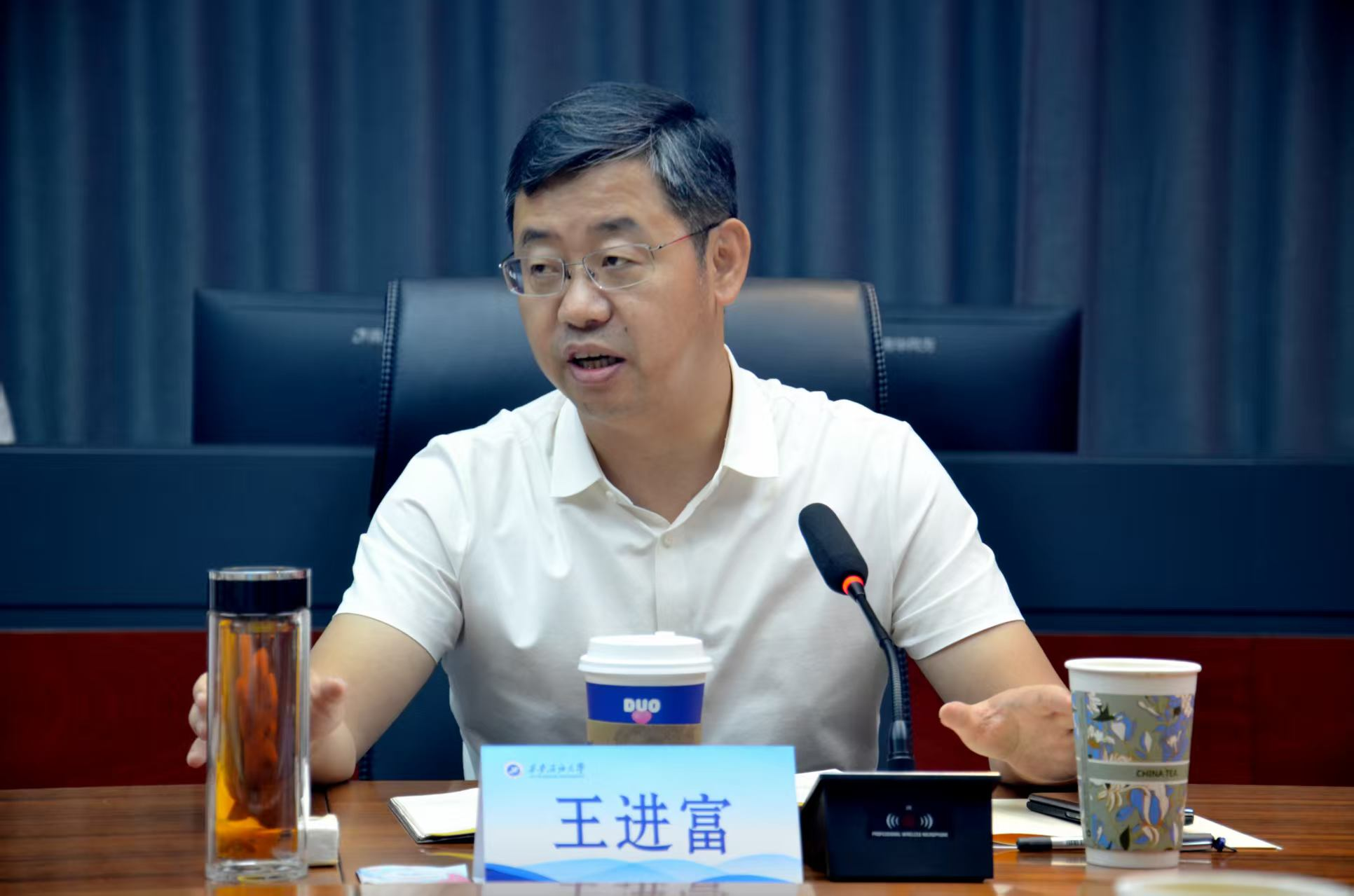 慰問(wèn)結(jié)束后,王進(jìn)富與15名本科生、研究生代表以“讀萬(wàn)卷書 行萬(wàn)里路—從研途到世界”為主題開展座談交流。他在認(rèn)真聽取同學(xué)們對(duì)學(xué)校發(fā)展的意見(jiàn)建議和自我學(xué)習(xí)成長(zhǎng)的感悟后,從改善學(xué)習(xí)條件、改革教學(xué)模式、拓寬國(guó)際化視野、體驗(yàn)文化差異等四個(gè)方面對(duì)同學(xué)們提出的問(wèn)題作了回應(yīng)。同時(shí),王進(jìn)富結(jié)合自身求學(xué)工作經(jīng)歷鼓勵(lì)同學(xué)們:一是使閱讀成為終身習(xí)慣。他指出,真正的讀書不僅是知識(shí)的積累,更是一場(chǎng)與自我的對(duì)話,建議同學(xué)們通過(guò)深度閱讀建立自己的知識(shí)體系,始終保持對(duì)知識(shí)的好奇與渴望,既要深耕專業(yè)領(lǐng)域,也要廣泛涉獵不同學(xué)科,在經(jīng)典著作中汲取智慧,在多元閱讀中培養(yǎng)獨(dú)立思考能力,讓書香伴隨成長(zhǎng)。二是在實(shí)踐中豐富人生體驗(yàn)。他建議同學(xué)們既要讀“有字之書”,也要讀“無(wú)字之書”,鼓勵(lì)同學(xué)們走出校園,在更廣闊的天地中學(xué)習(xí),無(wú)論是參與鄉(xiāng)村調(diào)研、企業(yè)實(shí)習(xí),還是赴海外交流,這些經(jīng)歷都能讓人突破認(rèn)知局限,理解世界的豐富性與多樣性。三是用開放心態(tài)擁抱廣闊天地。他希望同學(xué)們培養(yǎng)全球視野,既要立足本土文化,又要理解世界多樣性,在跨文化交流中提升格局,成為兼具文化底蘊(yùn)和國(guó)際視野的新時(shí)代人才。