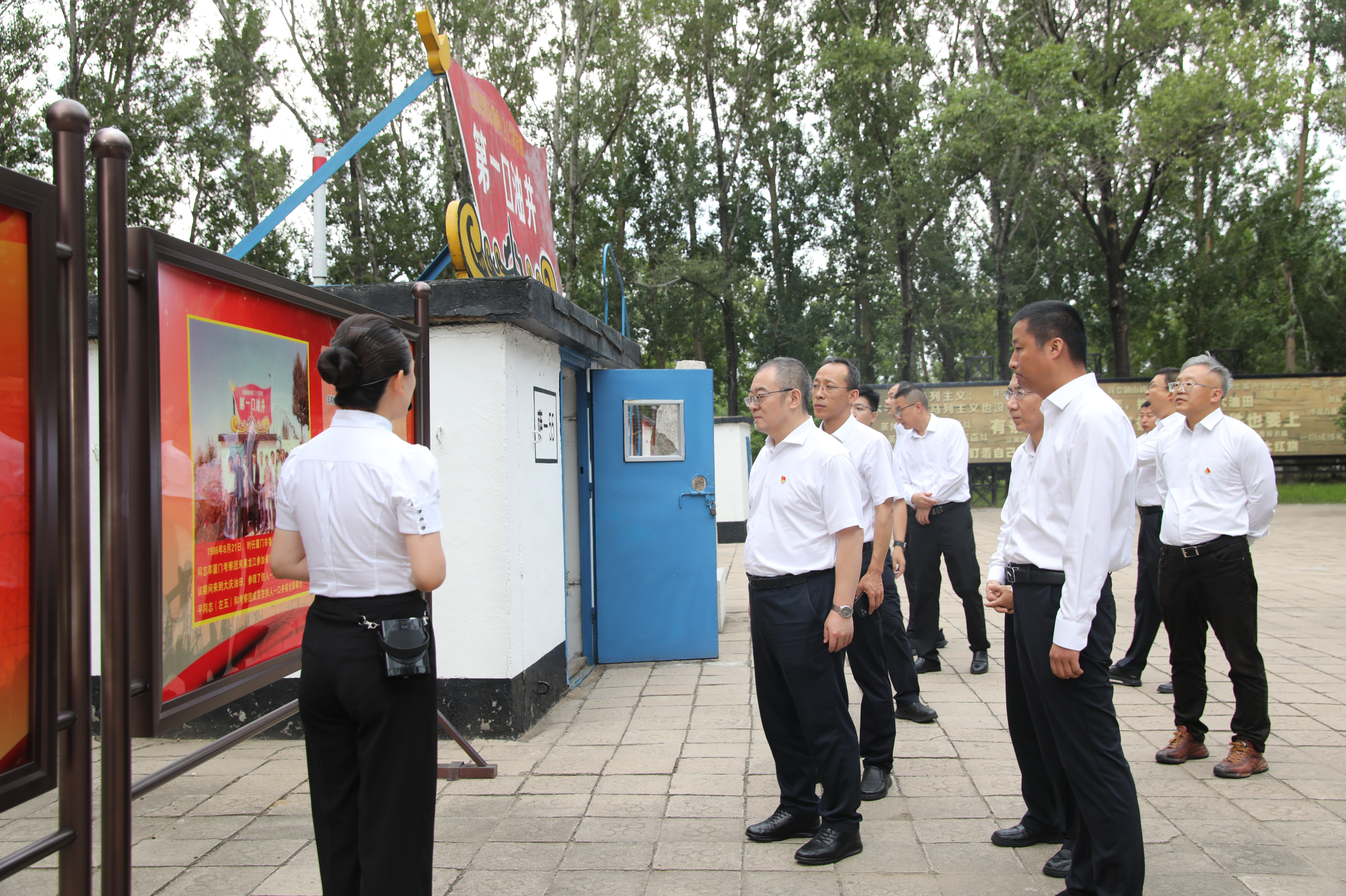在大慶走訪期間,8月8日,時值1205鉆井隊被授予“鋼鐵鉆井隊”稱號67周年紀念日。常江一行特地前往大慶鉆探鉆井二公司“鋼鐵鉆井隊”1205鉆井隊作業(yè)現(xiàn)場,參觀了1205鉆井隊隊史展覽館,見證了石油工程學院黨委與大慶鉆探鉆井二公司黨委在當天舉辦的黨建共建簽約儀式,勉勵共建各方各級答好“牢記重大囑托”的政治答卷、“培養(yǎng)時代新人”的育人答卷、“建設一流”的發(fā)展答卷。隨后,常江一行前往鐵人一口井教育培訓基地現(xiàn)場參觀薩-55井這一鐵人精神最具象征意義的物證,實地重溫“有條件要上,沒有條件創(chuàng)造條件也要上”的豪邁誓言。