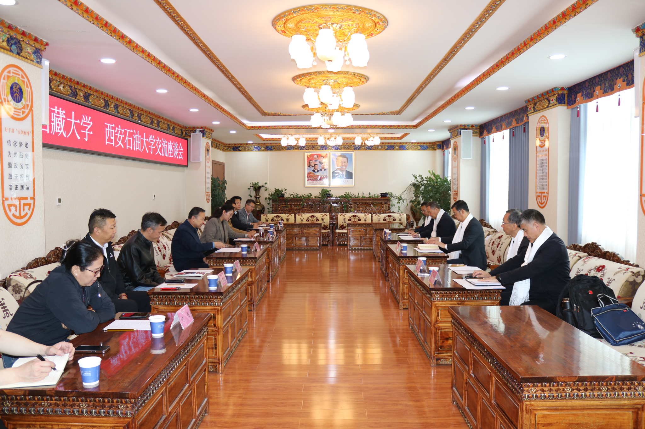 8月26日,王進(jìn)富一行與西藏大學(xué)黨委委員、副校長王斌禮及相關(guān)職能部門負(fù)責(zé)同志座談交流。王進(jìn)富表示,此次來訪是循著習(xí)近平總書記的足跡,踏著中央代表團(tuán)的步伐來藏調(diào)研考察交流,洽談合作,西藏大學(xué)作為西藏自治區(qū)高等教育的排頭兵,在服務(wù)地方經(jīng)濟(jì)社會發(fā)展中發(fā)揮著重要作用。西安石油大學(xué)愿與西藏大學(xué)攜手,充分發(fā)揮能源學(xué)科優(yōu)勢,共同開展高原能源資源勘探開發(fā)、清潔能源利用、生態(tài)環(huán)境保護(hù)等領(lǐng)域的研究,同時在人才聯(lián)合培養(yǎng)、留學(xué)生教育、員工培訓(xùn)、干部掛職、社會服務(wù)等方面加強(qiáng)合作,為推動西藏能源產(chǎn)業(yè)綠色轉(zhuǎn)型、服務(wù)國家能源安全戰(zhàn)略貢獻(xiàn)雙方力量,共同譜寫雪域高原高質(zhì)量發(fā)展新篇章。王斌禮對王進(jìn)富一行來訪表示熱烈歡迎,對學(xué)校給予的關(guān)心和支持表示感謝,并深情回顧了西藏自治區(qū)在以習(xí)近平同志為核心的黨中央堅強(qiáng)領(lǐng)導(dǎo)下,歷史性成就閃耀雪域,民族團(tuán)結(jié)進(jìn)步事業(yè)煥發(fā)新生,人民生活水平節(jié)節(jié)攀升,尤其強(qiáng)調(diào)能源基礎(chǔ)設(shè)施建設(shè)和綠色能源轉(zhuǎn)型對區(qū)域長治久安與高質(zhì)量發(fā)展起到的關(guān)鍵作用。希望雙方發(fā)揮特色優(yōu)勢,聚焦高原羌塘盆地油區(qū)勘探開發(fā),構(gòu)建協(xié)同創(chuàng)新機(jī)制,深化產(chǎn)學(xué)研深度融合,加強(qiáng)人才聯(lián)合培養(yǎng),助力西藏自治區(qū)將資源稟賦轉(zhuǎn)化為高質(zhì)量發(fā)展動能。