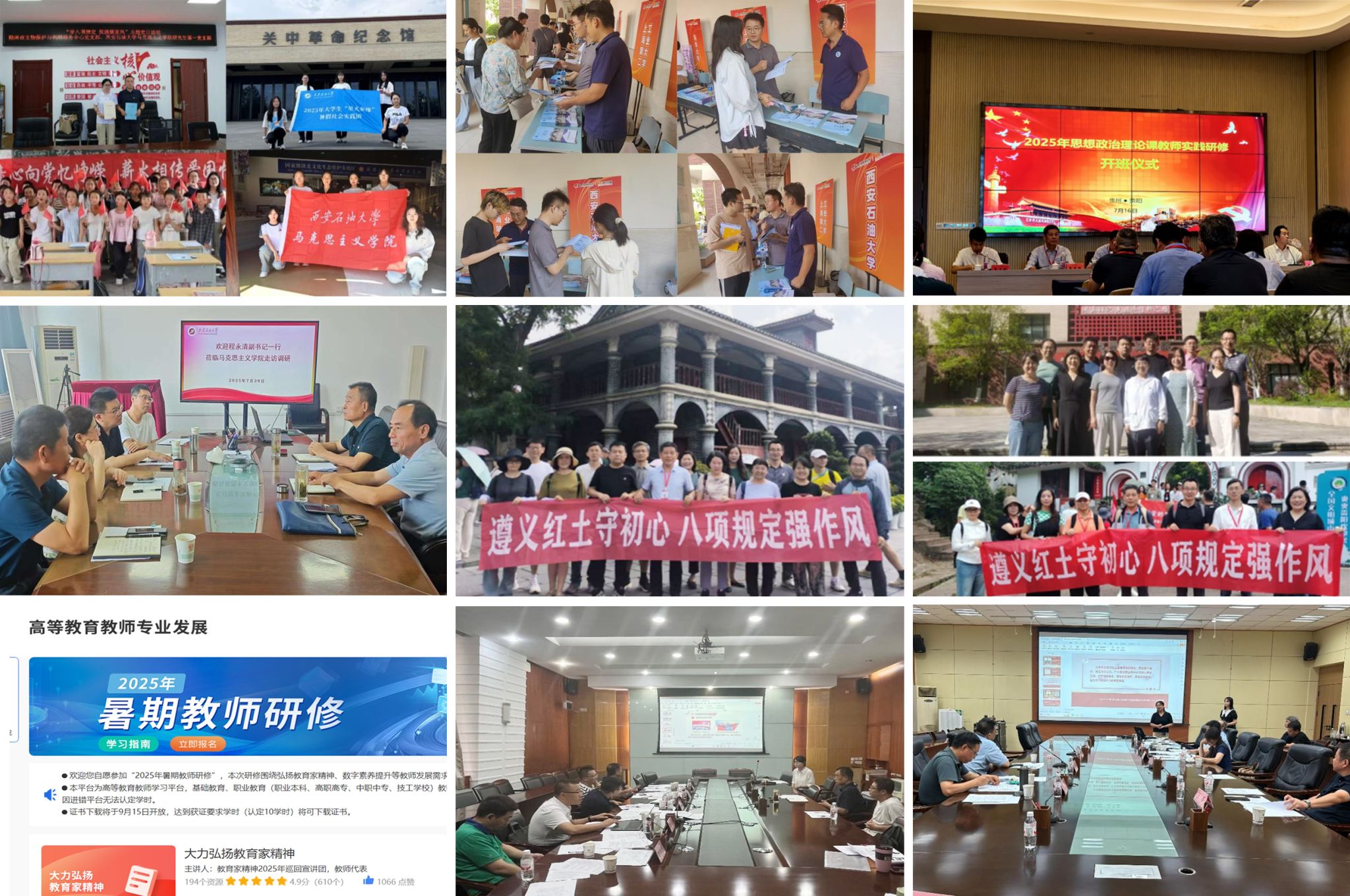 一是實(shí)踐育人強(qiáng)本領(lǐng)。組建6支實(shí)踐團(tuán)隊(duì)赴延安、咸陽(yáng)、山西朔州等地開(kāi)展“三下鄉(xiāng)”社會(huì)實(shí)踐活動(dòng);選派3名學(xué)生赴中國(guó)石油報(bào)社實(shí)習(xí),助力學(xué)生在實(shí)踐中成長(zhǎng)。二是研招宣傳拓生源。組織教師赴上海參加全國(guó)研究生招生咨詢會(huì),詳解學(xué)校優(yōu)勢(shì)與專(zhuān)業(yè)特色,精準(zhǔn)吸引優(yōu)質(zhì)生源,提升招生質(zhì)量。三是黨建工作提質(zhì)效。落實(shí)深入貫徹中央八項(xiàng)規(guī)定精神學(xué)習(xí)教育工作要求,完善問(wèn)題臺(tái)賬并推進(jìn)整改;邀請(qǐng)校領(lǐng)導(dǎo)調(diào)研指導(dǎo),鞏固學(xué)習(xí)成果。四是研修培訓(xùn)促提升。組織16名教師赴貴州參加思政課實(shí)踐研修;組織6名教工黨支部書(shū)記參加高?;鶎狱h組織示范班線上培訓(xùn),安排10名教師參與“人工智能賦能人才培養(yǎng)”線上培訓(xùn)。五是以賽促教磨真功。組織開(kāi)展四次思政課教師“大練兵”磨課活動(dòng);舉辦專(zhuān)家講評(píng)會(huì),邀請(qǐng)楊云霞等10位知名專(zhuān)家現(xiàn)場(chǎng)指導(dǎo),助力教師提升教學(xué)水平。