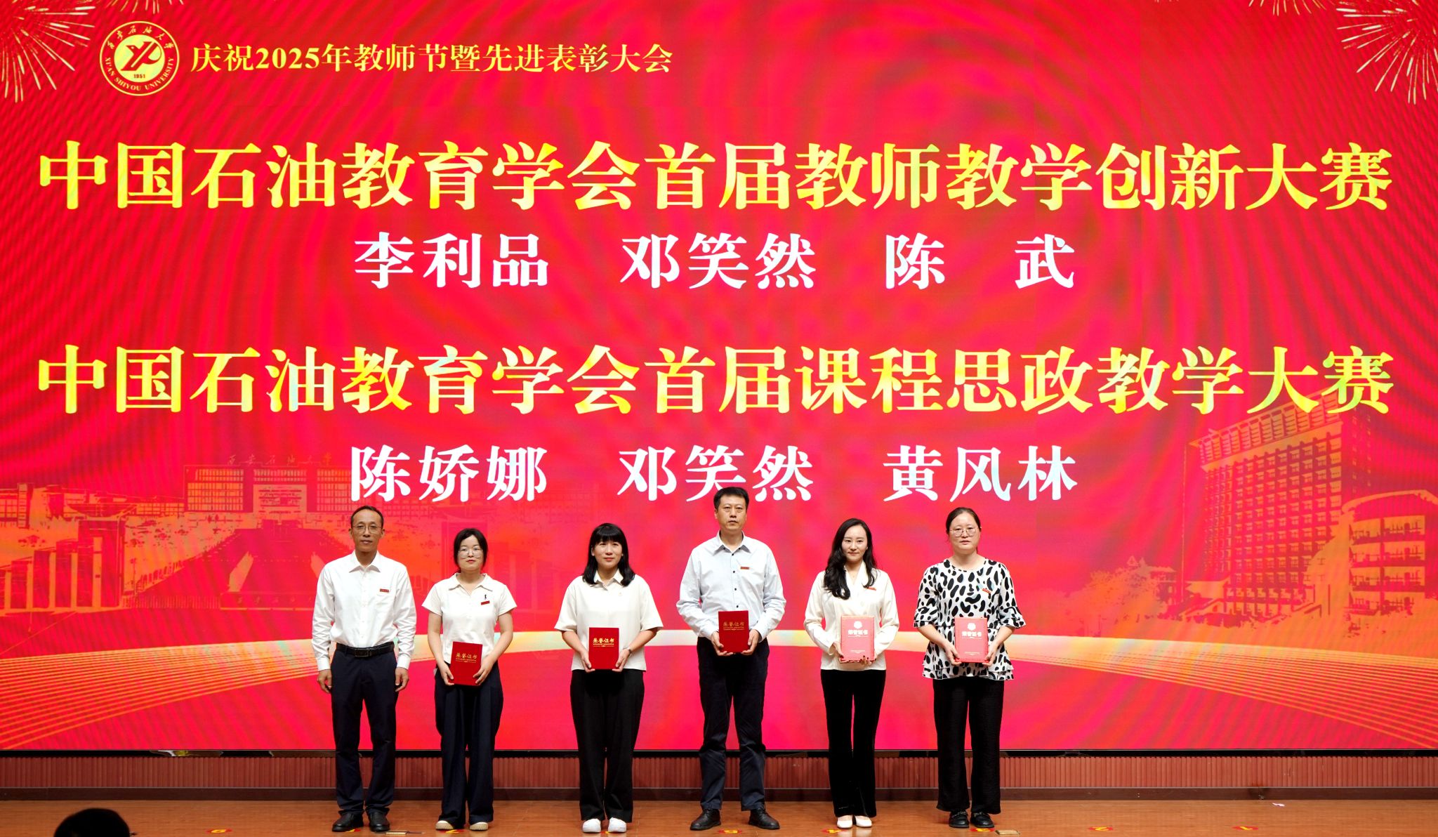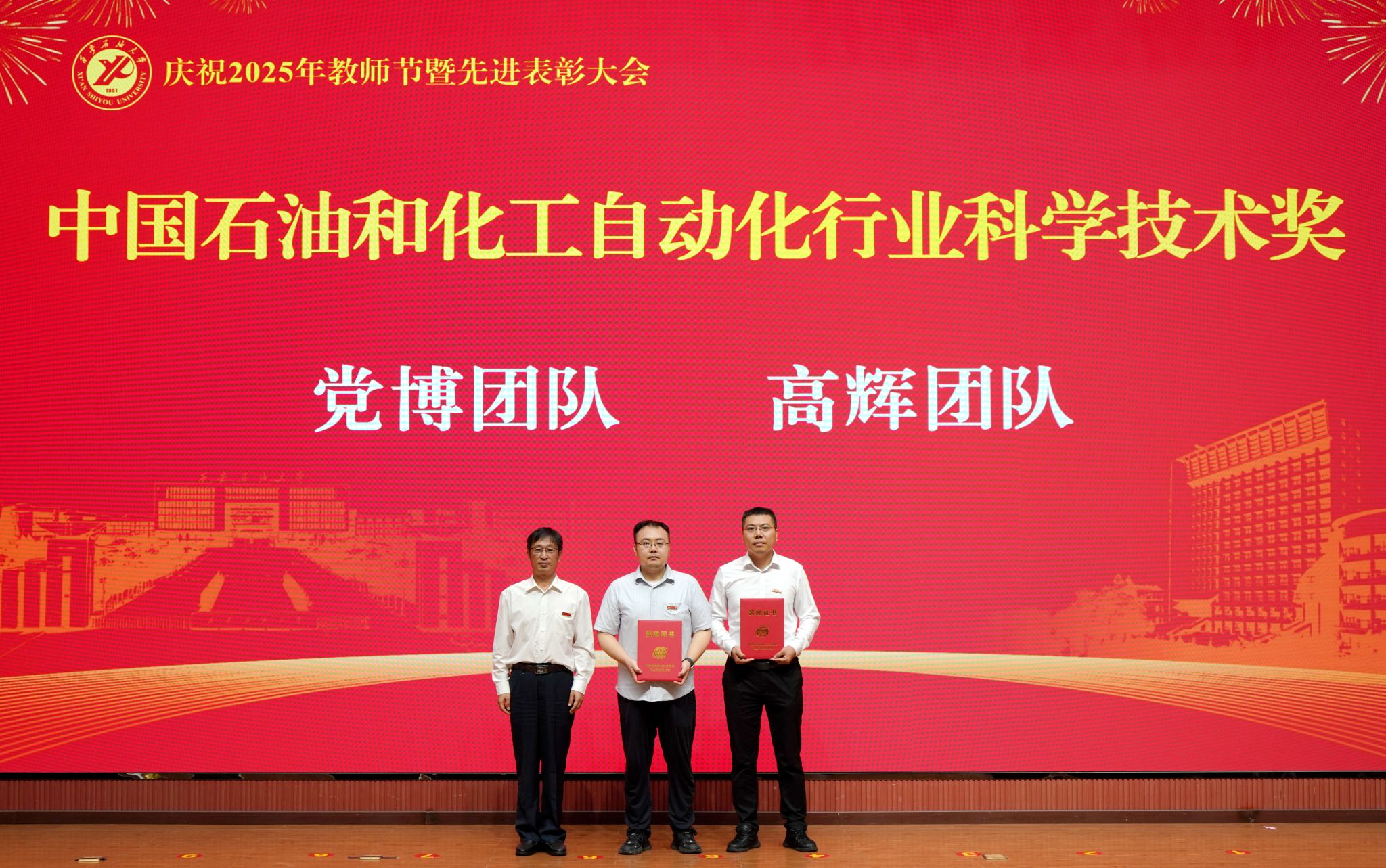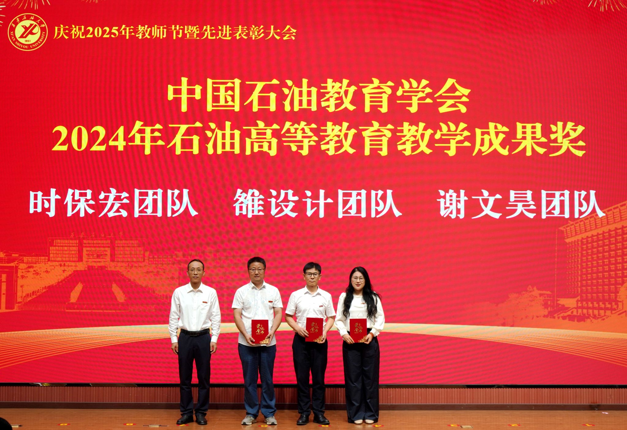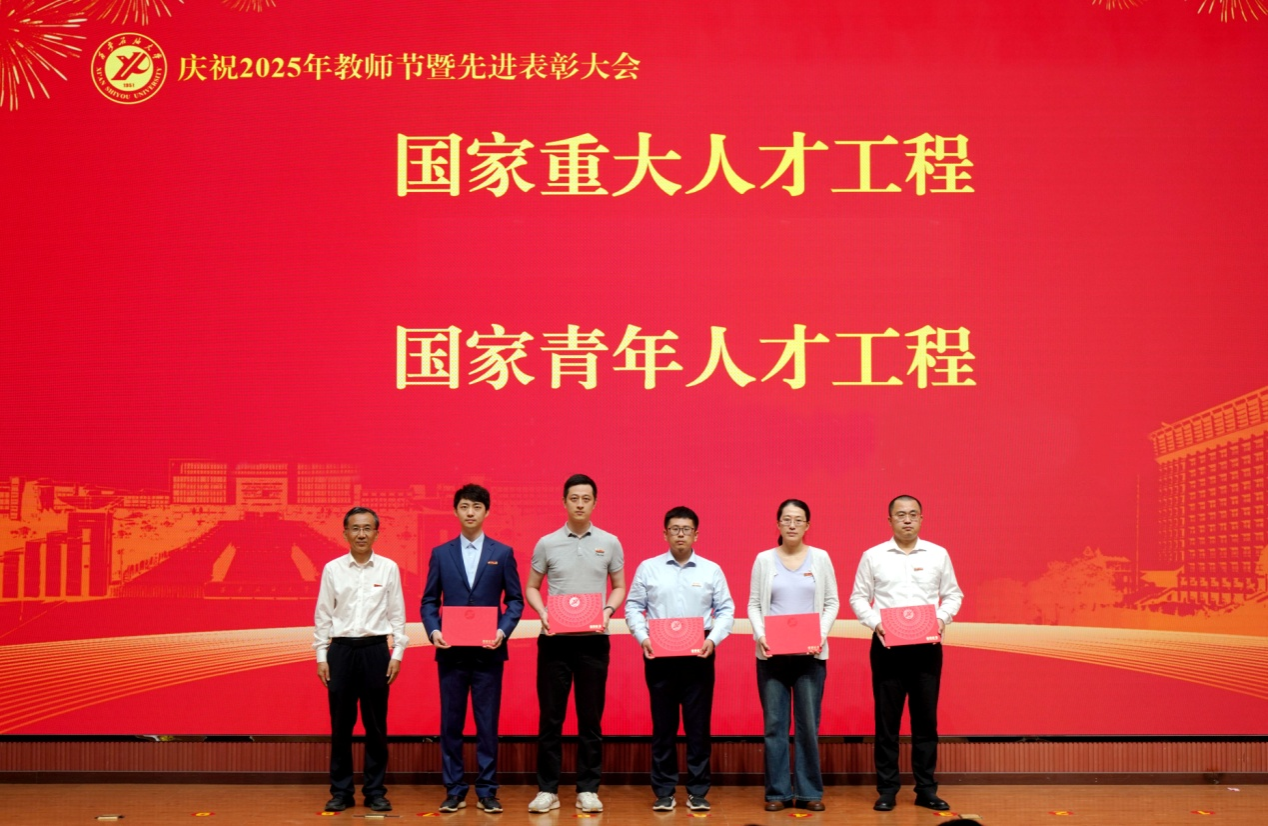 表彰大會在國歌聲中開始,校領(lǐng)導(dǎo)宣讀表彰決定,并為受表彰教師代表頒發(fā)證書和獎?wù)隆P|h委副書記張木宣讀2024年度陜西省科學(xué)技術(shù)進(jìn)步獎、國家重大人才工程和國家青年人才工程入選名單;校黨委副書記、紀(jì)委書記、監(jiān)察專員王輝強(qiáng)宣讀陜西省高層次人才特殊支持計劃等人選名單;副校長蘇文甫宣讀陜西高校優(yōu)秀青年人才支持計劃、陜西省“三秦博創(chuàng)”人才支持項目、中國石油和化工自動化行業(yè)科學(xué)技術(shù)獎獲獎名單;副校長張榮軍宣讀2025年陜西省科技計劃項目(第三批、第四批)、陜西省2023年高等教育教學(xué)成果獎和陜西省第十三屆基礎(chǔ)教育教學(xué)成果獎獲獎名單;副校長張君濤宣讀陜西省課程思政精品課程,中國石油教育學(xué)會2024年石油高等教育教學(xué)成果獎、首屆教師教學(xué)創(chuàng)新大賽、首屆課程思政教學(xué)大賽獲獎名單;副校長張驍勇宣讀《中共西安石油大學(xué)委員會關(guān)于表彰2025年師德先進(jìn)集體和先進(jìn)個人的決定》;副校長趙健宣讀《西安石油大學(xué)關(guān)于表彰獎勵“教書育人30年”教師的決定》《中共西安石油大學(xué)委員會 西安石油大學(xué)關(guān)于表彰2025年優(yōu)秀教師、先進(jìn)教育工作者的決定》;副校長種宇宏宣讀第21屆陜西青年五四獎?wù)潞偷诙萌珖髮W(xué)生職業(yè)規(guī)劃大賽陜西省決賽獲獎名單,全體與會校領(lǐng)導(dǎo)為受表彰教師代表頒發(fā)證書和獎?wù)隆?/p>