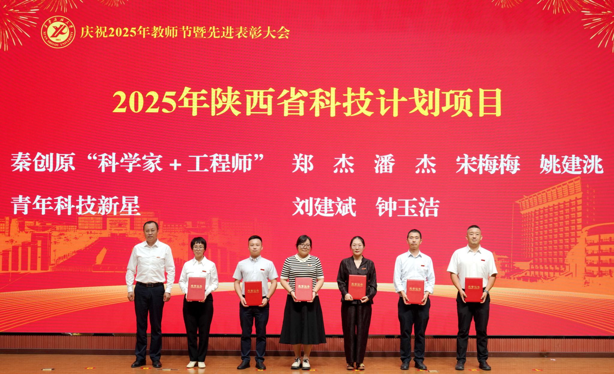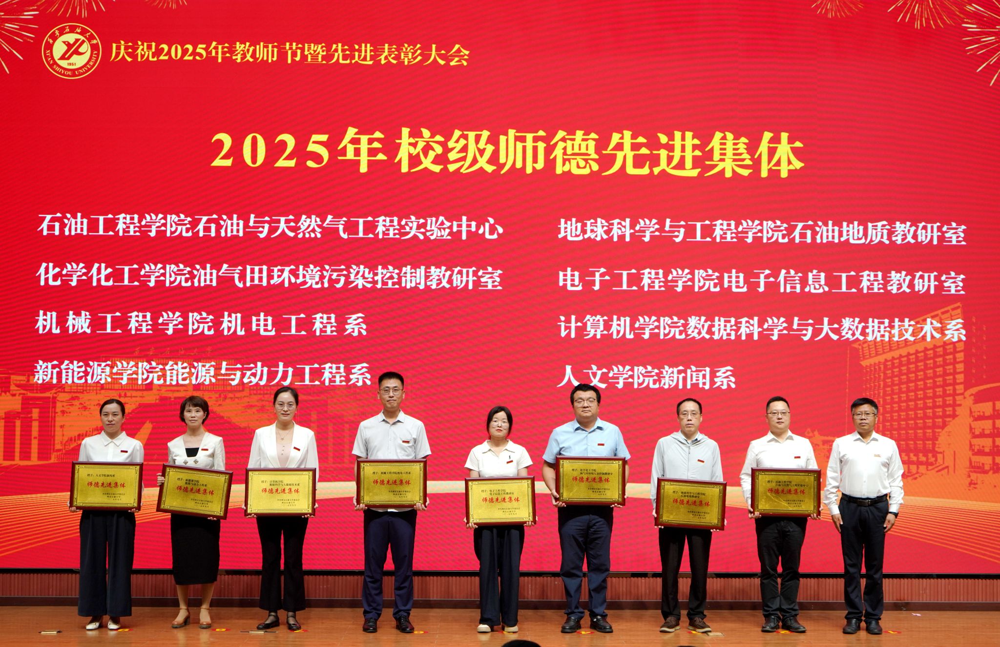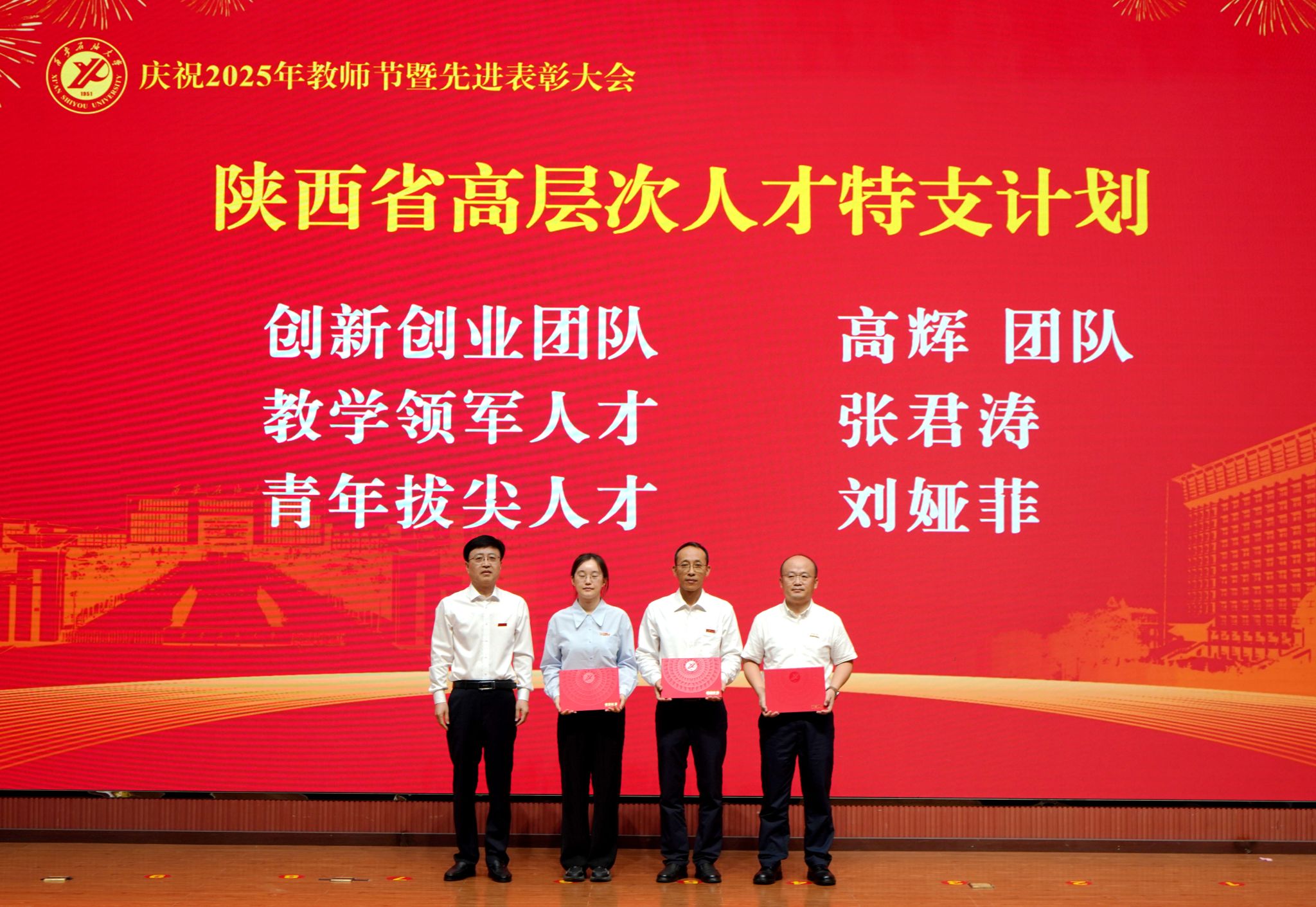 表彰大會在國歌聲中開始,校領(lǐng)導(dǎo)宣讀表彰決定,并為受表彰教師代表頒發(fā)證書和獎?wù)隆P|h委副書記張木宣讀2024年度陜西省科學(xué)技術(shù)進(jìn)步獎、國家重大人才工程和國家青年人才工程入選名單;校黨委副書記、紀(jì)委書記、監(jiān)察專員王輝強(qiáng)宣讀陜西省高層次人才特殊支持計劃等人選名單;副校長蘇文甫宣讀陜西高校優(yōu)秀青年人才支持計劃、陜西省“三秦博創(chuàng)”人才支持項目、中國石油和化工自動化行業(yè)科學(xué)技術(shù)獎獲獎名單;副校長張榮軍宣讀2025年陜西省科技計劃項目(第三批、第四批)、陜西省2023年高等教育教學(xué)成果獎和陜西省第十三屆基礎(chǔ)教育教學(xué)成果獎獲獎名單;副校長張君濤宣讀陜西省課程思政精品課程,中國石油教育學(xué)會2024年石油高等教育教學(xué)成果獎、首屆教師教學(xué)創(chuàng)新大賽、首屆課程思政教學(xué)大賽獲獎名單;副校長張驍勇宣讀《中共西安石油大學(xué)委員會關(guān)于表彰2025年師德先進(jìn)集體和先進(jìn)個人的決定》;副校長趙健宣讀《西安石油大學(xué)關(guān)于表彰獎勵“教書育人30年”教師的決定》《中共西安石油大學(xué)委員會 西安石油大學(xué)關(guān)于表彰2025年優(yōu)秀教師、先進(jìn)教育工作者的決定》;副校長種宇宏宣讀第21屆陜西青年五四獎?wù)潞偷诙萌珖髮W(xué)生職業(yè)規(guī)劃大賽陜西省決賽獲獎名單,全體與會校領(lǐng)導(dǎo)為受表彰教師代表頒發(fā)證書和獎?wù)隆?/p>