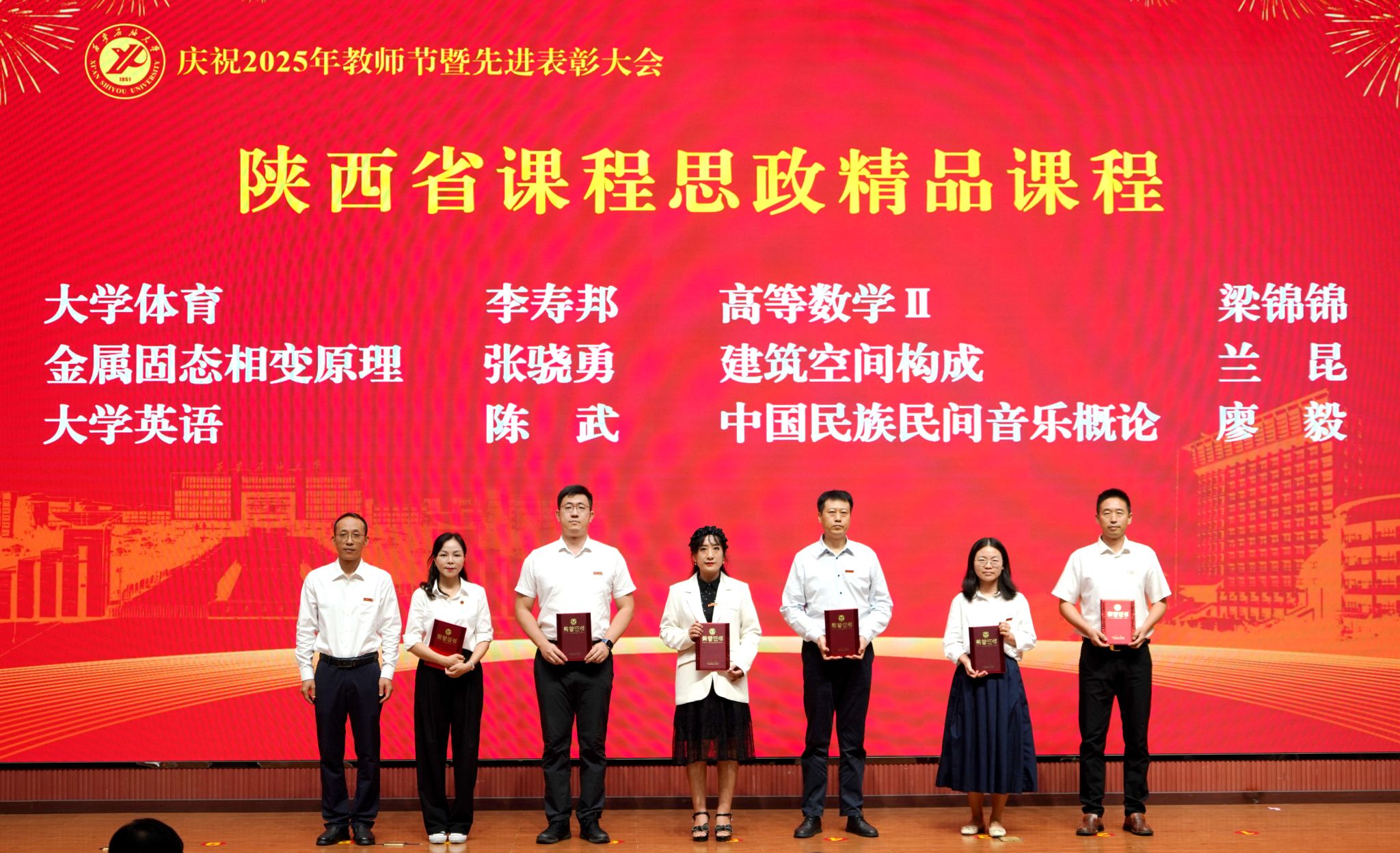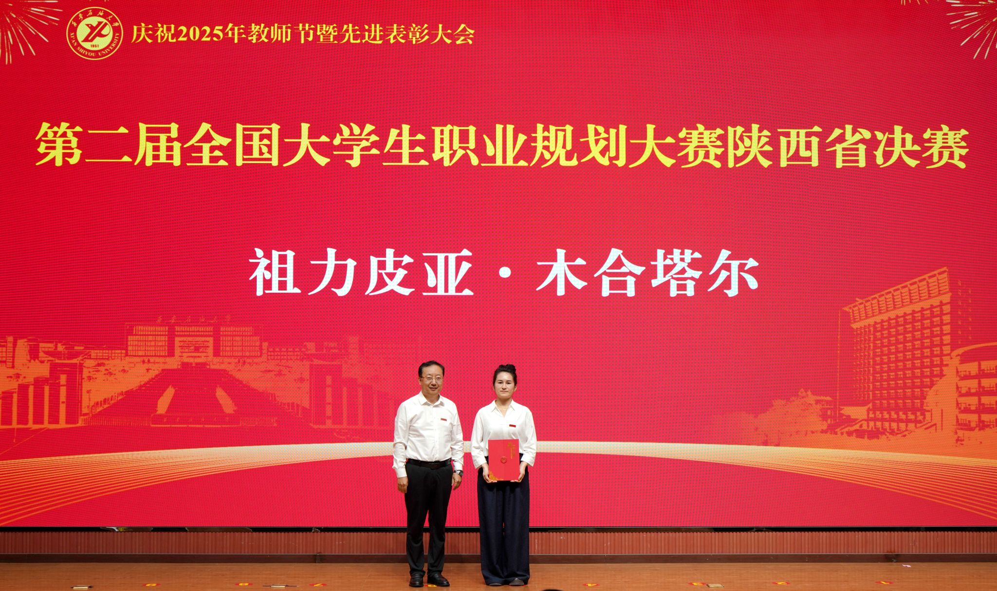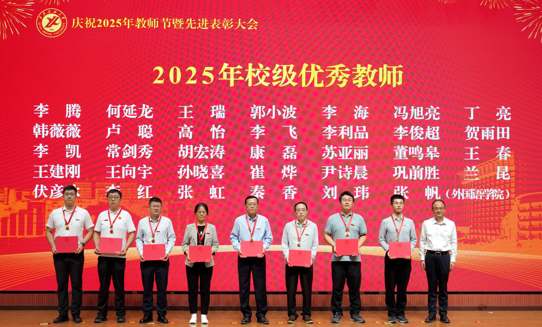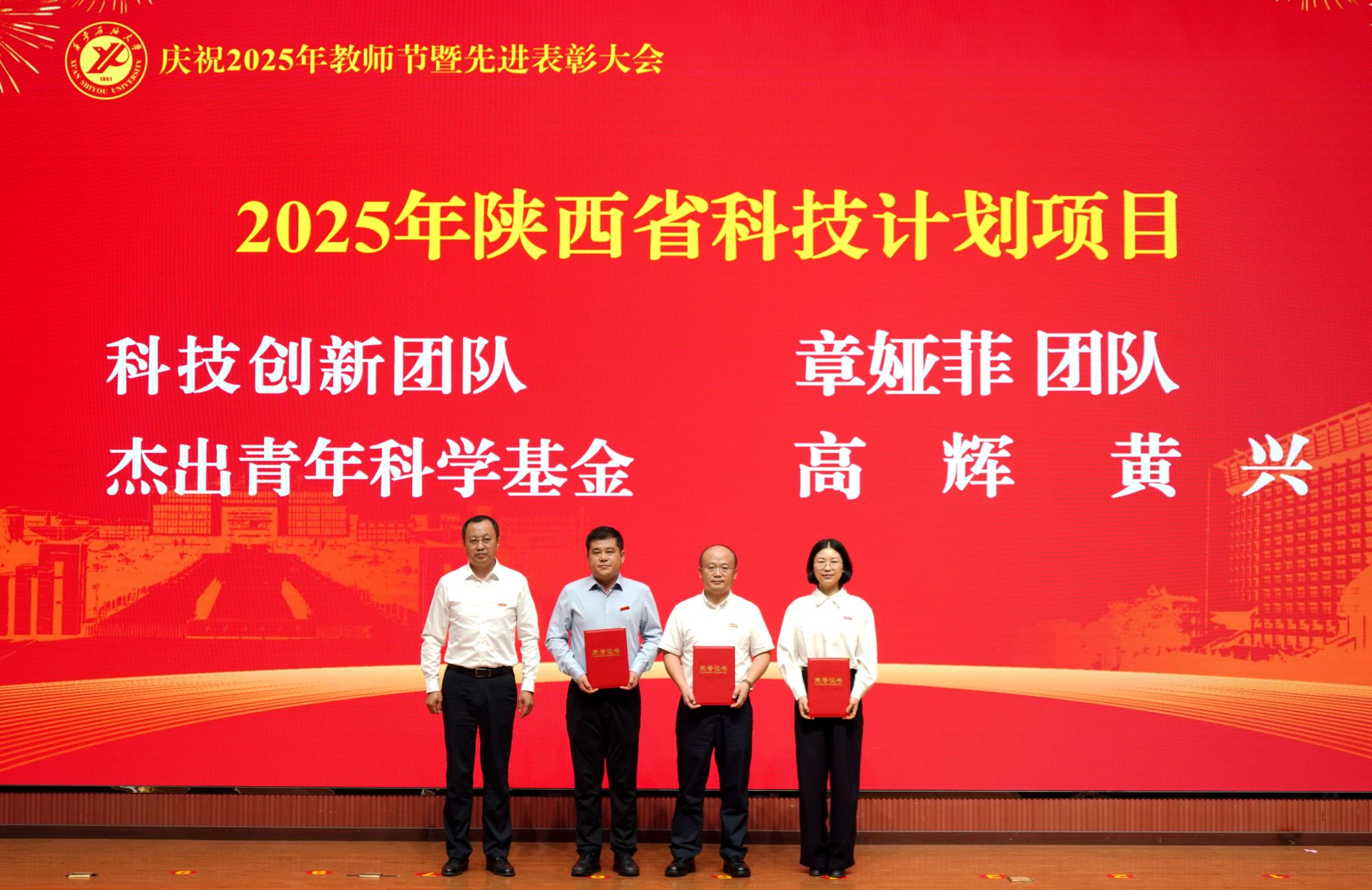 表彰大會在國歌聲中開始,校領(lǐng)導(dǎo)宣讀表彰決定,并為受表彰教師代表頒發(fā)證書和獎?wù)隆P|h委副書記張木宣讀2024年度陜西省科學(xué)技術(shù)進(jìn)步獎、國家重大人才工程和國家青年人才工程入選名單;校黨委副書記、紀(jì)委書記、監(jiān)察專員王輝強(qiáng)宣讀陜西省高層次人才特殊支持計劃等人選名單;副校長蘇文甫宣讀陜西高校優(yōu)秀青年人才支持計劃、陜西省“三秦博創(chuàng)”人才支持項目、中國石油和化工自動化行業(yè)科學(xué)技術(shù)獎獲獎名單;副校長張榮軍宣讀2025年陜西省科技計劃項目(第三批、第四批)、陜西省2023年高等教育教學(xué)成果獎和陜西省第十三屆基礎(chǔ)教育教學(xué)成果獎獲獎名單;副校長張君濤宣讀陜西省課程思政精品課程,中國石油教育學(xué)會2024年石油高等教育教學(xué)成果獎、首屆教師教學(xué)創(chuàng)新大賽、首屆課程思政教學(xué)大賽獲獎名單;副校長張驍勇宣讀《中共西安石油大學(xué)委員會關(guān)于表彰2025年師德先進(jìn)集體和先進(jìn)個人的決定》;副校長趙健宣讀《西安石油大學(xué)關(guān)于表彰獎勵“教書育人30年”教師的決定》《中共西安石油大學(xué)委員會 西安石油大學(xué)關(guān)于表彰2025年優(yōu)秀教師、先進(jìn)教育工作者的決定》;副校長種宇宏宣讀第21屆陜西青年五四獎?wù)潞偷诙萌珖髮W(xué)生職業(yè)規(guī)劃大賽陜西省決賽獲獎名單,全體與會校領(lǐng)導(dǎo)為受表彰教師代表頒發(fā)證書和獎?wù)隆?/p>