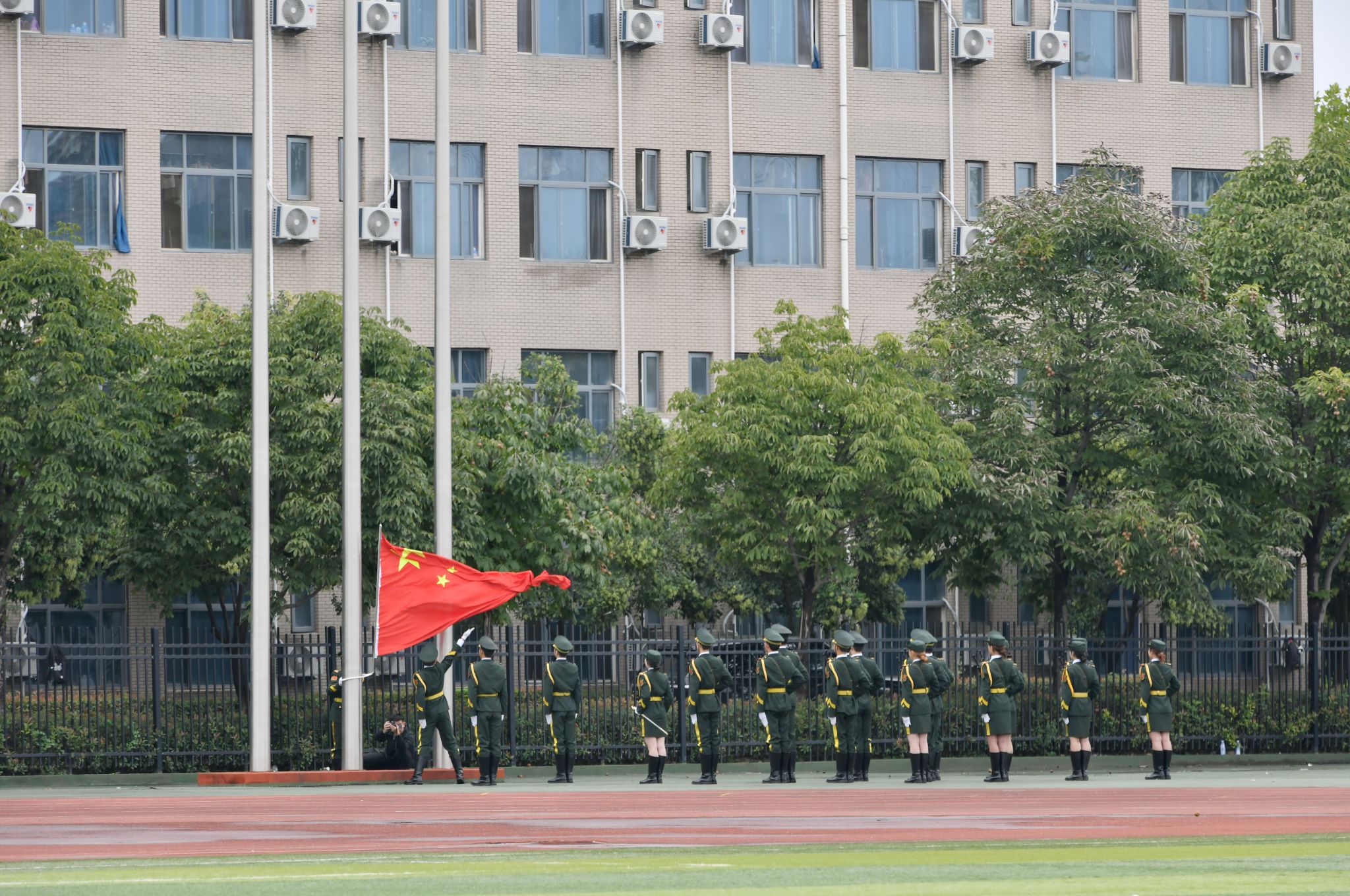 大會在莊嚴(yán)的升國旗儀式中拉開帷幕。國旗護(hù)衛(wèi)隊踢著鏗鏘的步伐,每一聲踏地都猶如驚雷叩擊青春熱血;鮮艷的五星紅旗冉冉升起,激昂的國歌聲響徹校園,在場師生、教官莊嚴(yán)肅立,向國旗行注目禮。
