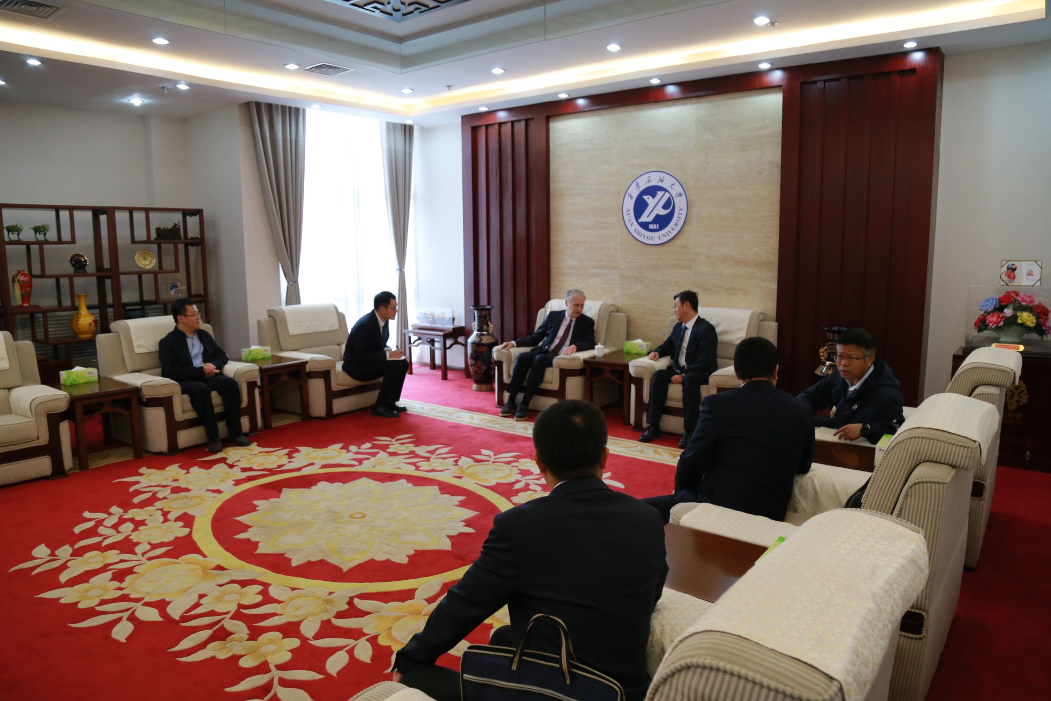 報告會前,校長王進富在鄠邑校區(qū)圖書館接待室會見舍恩伯格教授。副校長張驍勇參加會見。