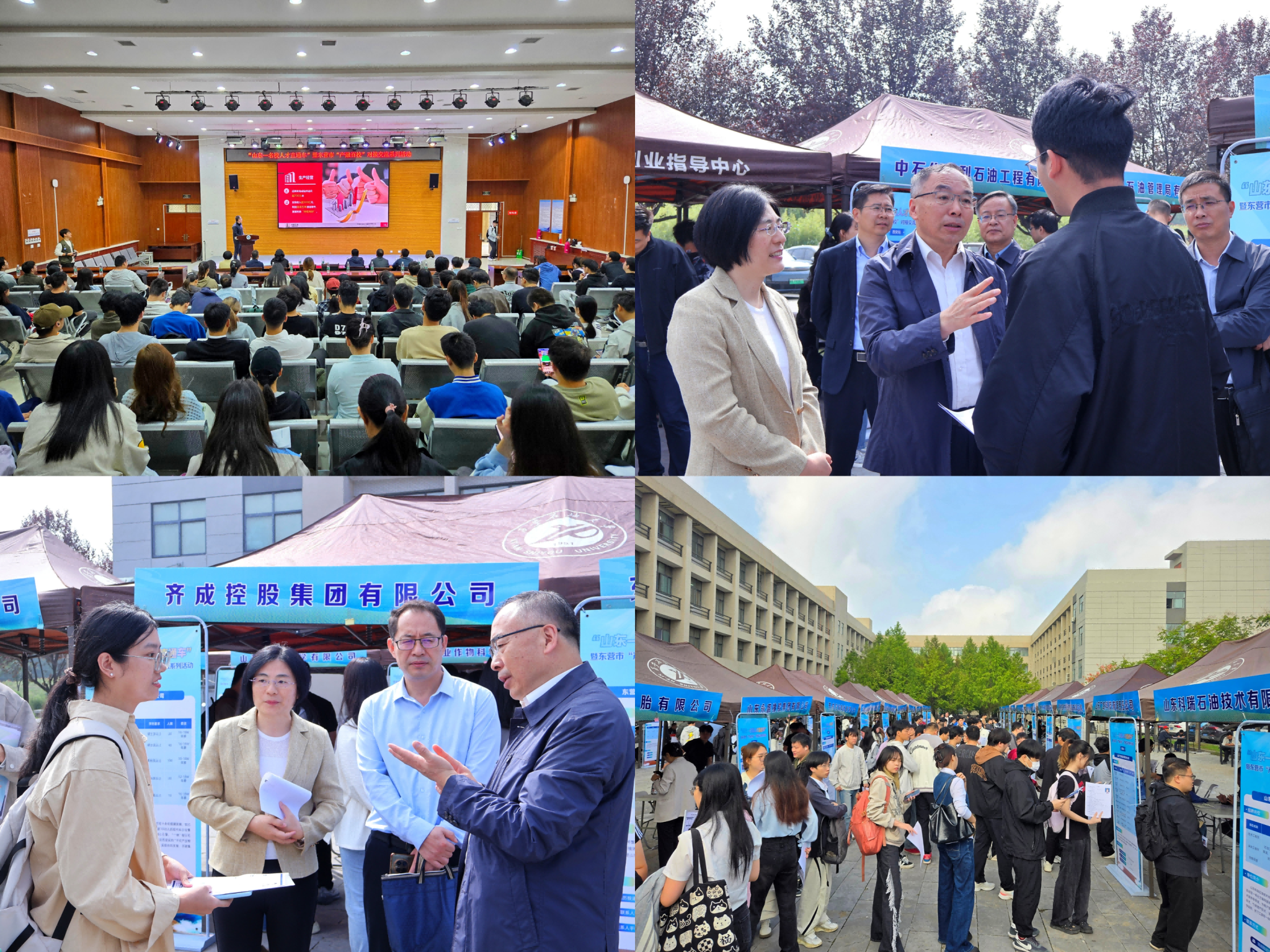 與此同時,東營市組團專場招聘會在崇文樓118報告廳和江漢林廣場同步開展,東營市公共就業(yè)和人才服務中心副主任朱鳳鸞詳細介紹了當地人才發(fā)展環(huán)境、住房補貼、就業(yè)扶持等優(yōu)惠政策。多家重點企業(yè)代表圍繞企業(yè)主營業(yè)務、崗位需求、發(fā)展前景等內容進行宣講,現場解答學生關于職業(yè)規(guī)劃、崗位要求等疑問,吸引兩百余名畢業(yè)生到場聆聽,為畢業(yè)生與企業(yè)搭建起直接溝通的橋梁。宣講會后,省市領導在學校相關負責人陪同下前往招聘現場,實地查看畢業(yè)生求職情況?,F場氣氛熱烈,畢業(yè)生們積極與企業(yè)招聘人員交流,圍繞崗位專業(yè)要求、薪資待遇、職業(yè)發(fā)展空間等問題深入咨詢,部分學生與企業(yè)初步達成就業(yè)意向。隨后,校地雙方領導參觀我校校史館及鐵人王進喜紀念館,通過歷史圖片、實物展品與文字介紹,全面了解我校的發(fā)展歷程、辦學成就與人才培養(yǎng)特色,對我校長期扎根能源領域、為國家能源事業(yè)發(fā)展作出的貢獻給予高度評價。