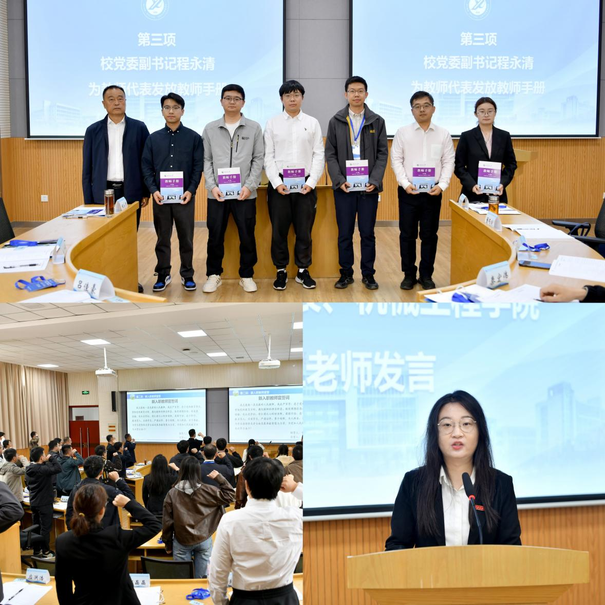 9月24日上午,培訓(xùn)班在明德校區(qū)明德樓110教室舉辦開班式,校黨委副書記程永清出席開班式。開班式上,程永清為教師代表發(fā)放教師手冊(cè)。教師工作部部長武曉朦詳細(xì)介紹了部門情況和本次研修課程安排情況,并做紀(jì)律要求。石油工程學(xué)院新入職教師常元昊領(lǐng)誓,全體教師宣誓。新入職教師代表、機(jī)械工程學(xué)院田靜卓作表態(tài)發(fā)言。