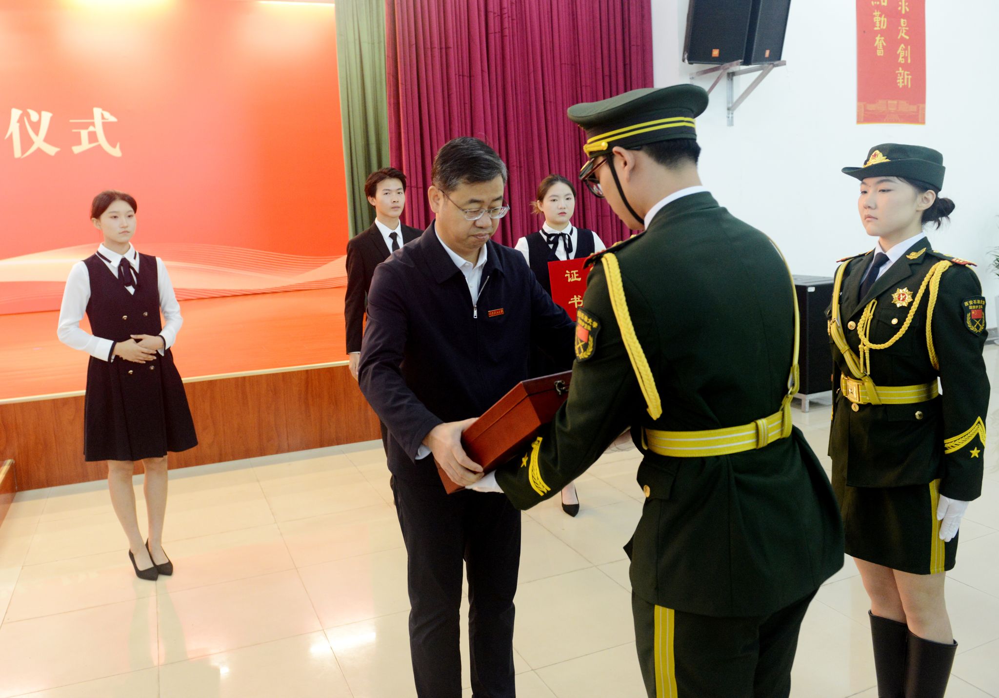 10月12日,時值西安石油大學(xué)74周年校慶日,我校在鄠邑校區(qū)騰輝大學(xué)生活動中心舉行迎接天安門廣場國旗儀式。一面曾于2021年10月12日,暨我校建校70周年校慶日,在天安門廣場升掛過的國旗,經(jīng)天安門地區(qū)管委會批準(zhǔn)贈予學(xué)校。全體校領(lǐng)導(dǎo)、處科級干部代表、民主黨派代表、校友代表及師生代表共計600余人參加儀式,儀式由副校長種宇宏主持。