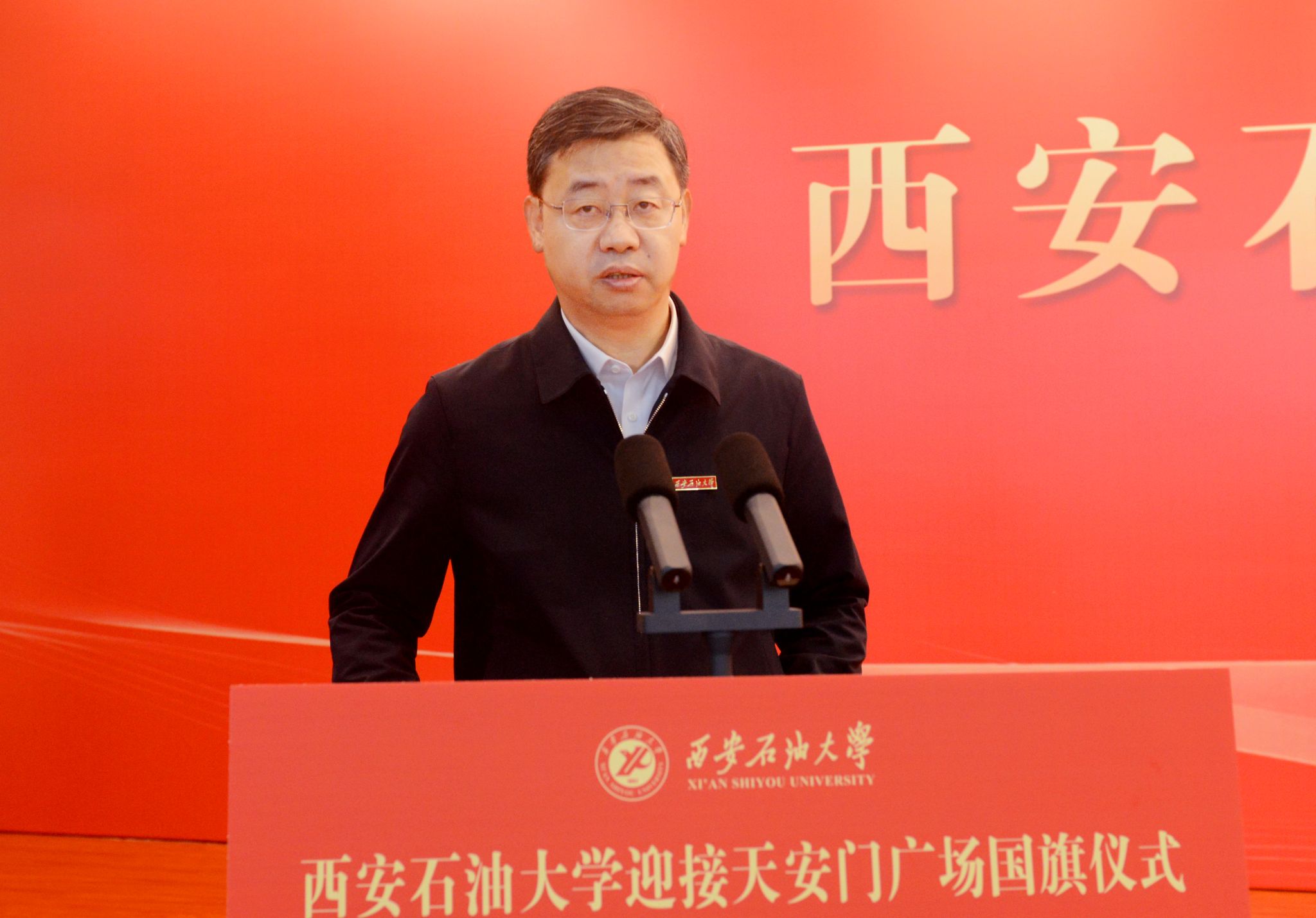 校長王進(jìn)富發(fā)表致辭,他總結(jié)回顧了學(xué)校74年來與黨和國家同向同行、為祖國能源事業(yè)不懈奮斗的辦學(xué)歷程,強調(diào)學(xué)校始終“以‘石’為基、以‘油’鑄魂”, 在服務(wù)國家能源戰(zhàn)略中彰顯使命擔(dān)當(dāng),培養(yǎng)了一批又一批能源領(lǐng)域的棟梁之才。他向全體師生提出三點希望:一是希望全體師生高擎信仰之炬,把弘揚愛國主義精神作為永恒主題。要持續(xù)發(fā)揮好這面國旗的愛國主義教育功能,開展內(nèi)容豐富、形式多樣的愛國主義教育活動,營造愛黨愛國、愛校榮校的濃厚氛圍;二是希望全體師生堅定強國信念,把踐行奮斗實干擔(dān)當(dāng)作為精神底色。要堅持石油精神辦學(xué)、鐵人精神育人、延安精神鑄魂,秉承“愛國奉獻(xiàn)、艱苦奮斗、科學(xué)求實、開拓進(jìn)取”的辦學(xué)精神,全面落實立德樹人根本任務(wù),不斷提升服務(wù)國家能源戰(zhàn)略與區(qū)域發(fā)展的能力,在教育強國建設(shè)中展現(xiàn)更大作為;三是希望全體師生挺膺擔(dān)當(dāng)之志,把矢志能源報國使命作為畢生追求。廣大教師要弘揚教育家精神,以赤誠之心、奉獻(xiàn)之心、仁愛之心教書育人,做學(xué)生成長的引路人,廣大學(xué)子要秉承“好學(xué)力行、自強不息”的校訓(xùn),傳承鐵人精神,將使命扛在肩頭,為國家能源事業(yè)貢獻(xiàn)青春力量。