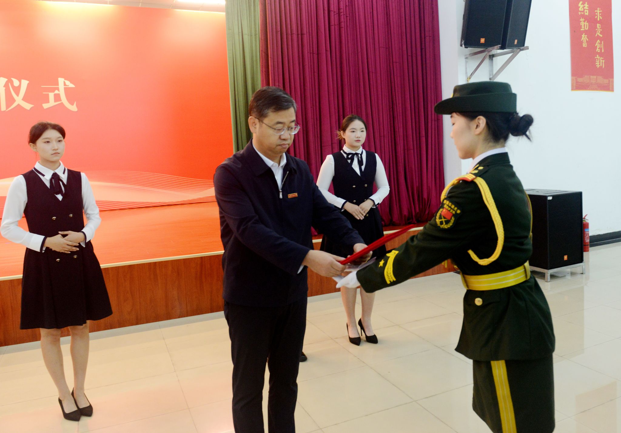 上午8時,儀式在莊嚴(yán)的氛圍中正式開始。校長王進(jìn)富將獲贈的國旗及證書鄭重交予學(xué)校國旗護(hù)衛(wèi)隊,國旗護(hù)衛(wèi)隊隊員神情肅穆,步伐鏗鏘,莊嚴(yán)地護(hù)送國旗入場。這面國旗旗長5米、寬3.3米,為超大國旗,整幅旗面無拼接,五顆星由織造人員手工縫制,工藝特殊,承載著億萬中華兒女的深厚愛國情懷,也凝聚著我校建校70周年的特別紀(jì)念。