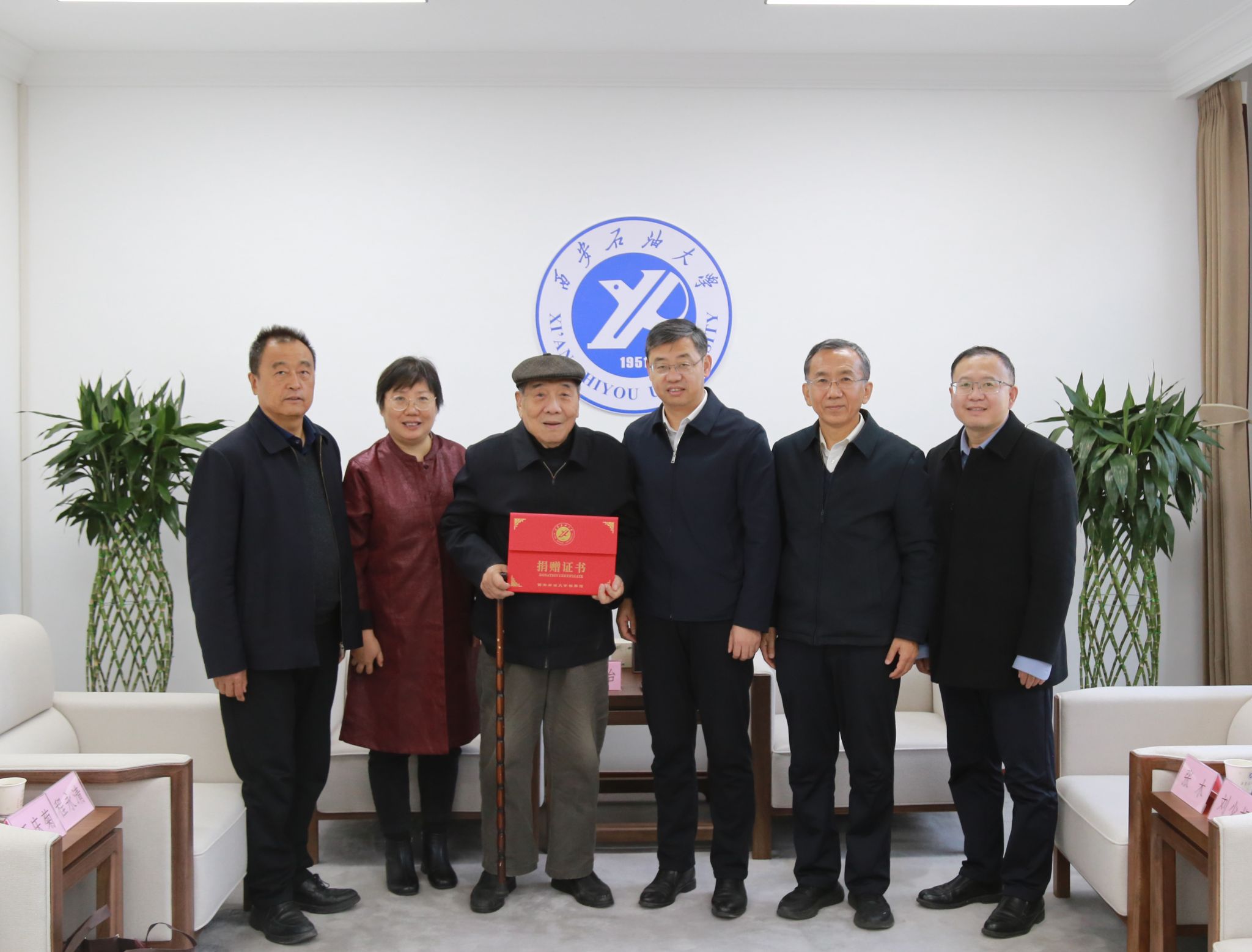 11月17日下午,我校54級校友王國治向?qū)W校捐贈了西安石油學?!叭脤W生”獎狀、西安石油學校畢業(yè)證明、1978年全國科技大會獎勵證書等珍貴檔案。校長王進富,校黨委副書記張木、程永清在鄠邑校區(qū)行政樓二樓接待室會見王國治及其女兒王慶菊女士,并進行了交流座談。