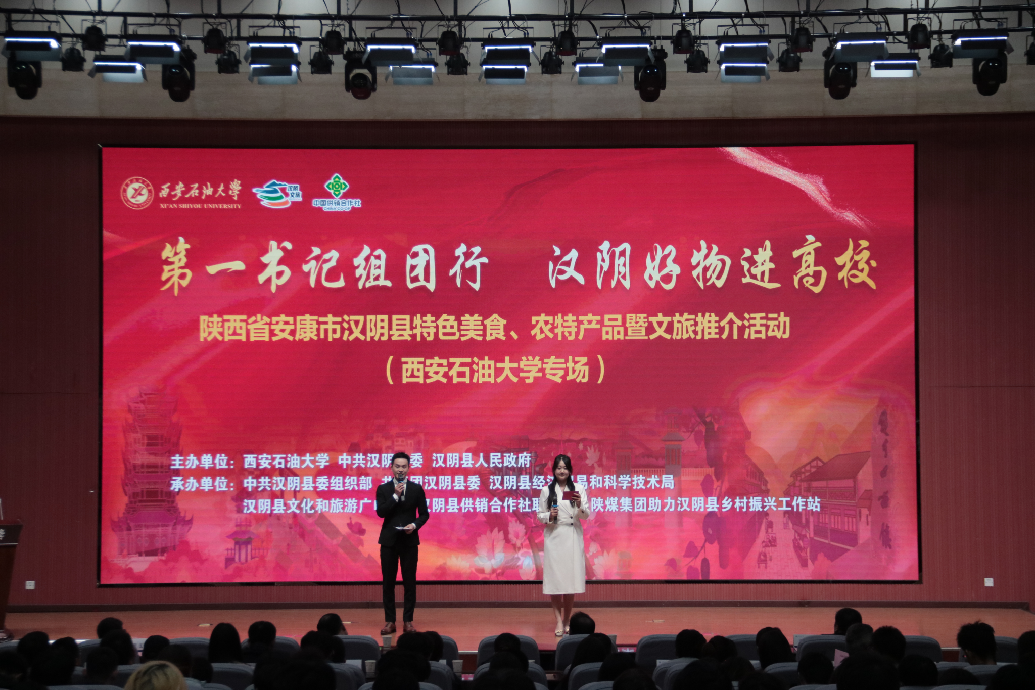 11月20日,“第一書記組團行?漢陰好物進高?!薄兾魇“部凳袧h陰縣特色美食、農(nóng)特產(chǎn)品暨文旅推介活動在我校鄠邑校區(qū)成功舉辦。漢陰縣委副書記王眾義,縣委常委、組織部長李萬華,縣政府黨組成員屈斐斐,縣委組織部、共青團漢陰縣委、經(jīng)濟貿(mào)易和科學技術局、文化和旅游廣電局、供銷合作社聯(lián)合社、陜煤集團助力漢陰縣鄉(xiāng)村振興工作站等單位負責人,省市縣部分派駐漢陰縣駐村第一書記和工作隊員代表,我校副校長種宇宏,黨委組織部、黨委學生工作部、校團委、教務處、科研處、校友工作與合作交流處、后勤處、西安石大資產(chǎn)經(jīng)營有限公司等單位負責人,各院(系)團委(團總支)書記,學生代表參與活動。
