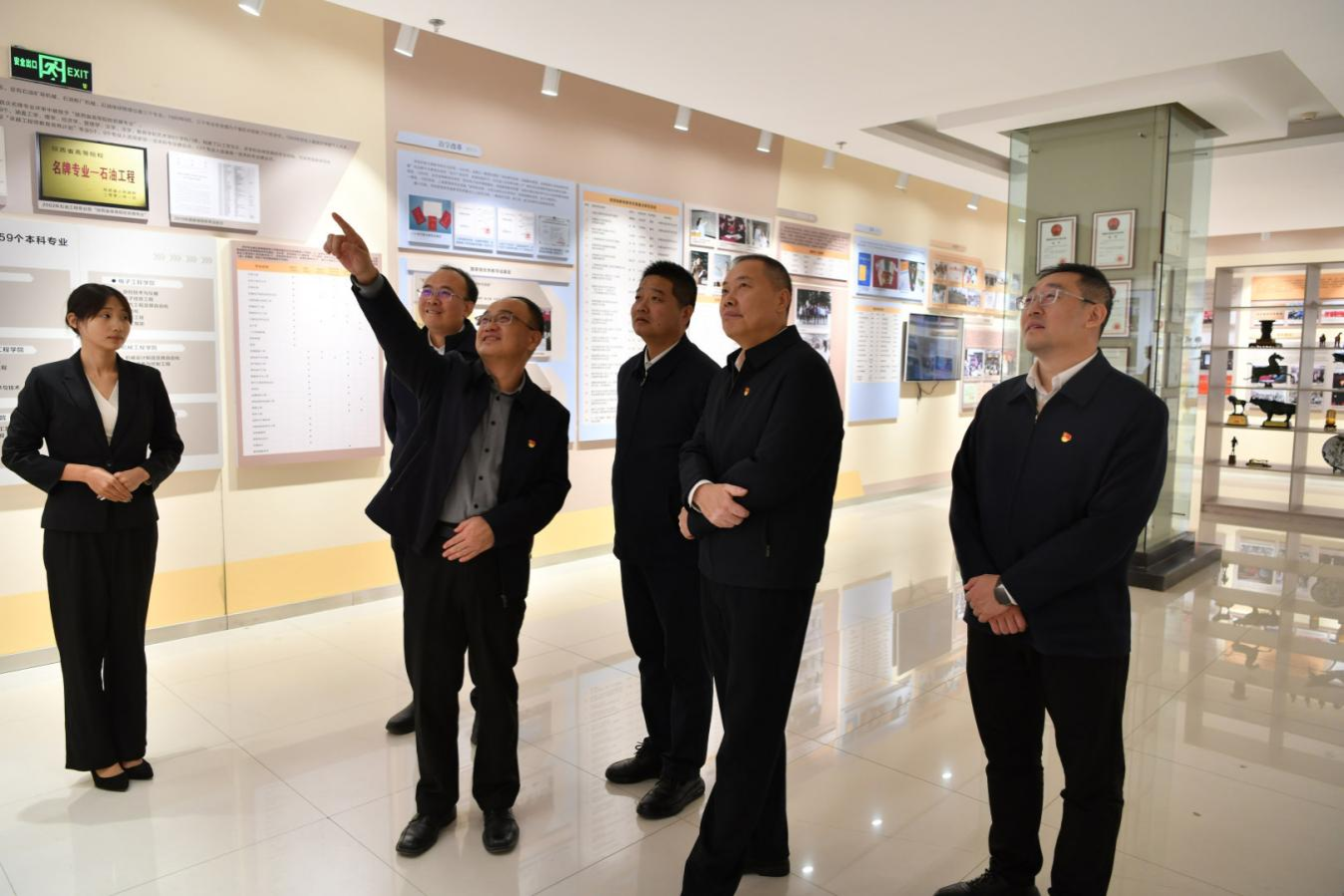 楊健、焦群朝一行與副校長趙健、黨委辦公室(校長辦公室)負(fù)責(zé)同志共同參觀我校鐵人王進喜紀(jì)念館和校史館,開展沉浸式學(xué)習(xí)交流。大家先后在鐵人王進喜紀(jì)念館鉆井設(shè)備實物、會戰(zhàn)場景復(fù)原展區(qū)及校史館校友事跡、學(xué)校發(fā)展成果展前駐足停留,在珍貴史料與生動場景中追尋精神根脈、感悟辦學(xué)初心。趙健結(jié)合展區(qū)實物與歷史背景,深入解讀了鐵人王進喜“攻堅克難、無私奉獻”的精神內(nèi)核,詳細(xì)講述了學(xué)校自創(chuàng)辦以來,從服務(wù)行業(yè)發(fā)展到助力國家能源事業(yè)高質(zhì)量發(fā)展的奮進歷程。在參觀過程中,雙方圍繞黨建賦能、文化傳承、人才培養(yǎng)等內(nèi)容深入交流,在精神共鳴中凝聚合作共識。