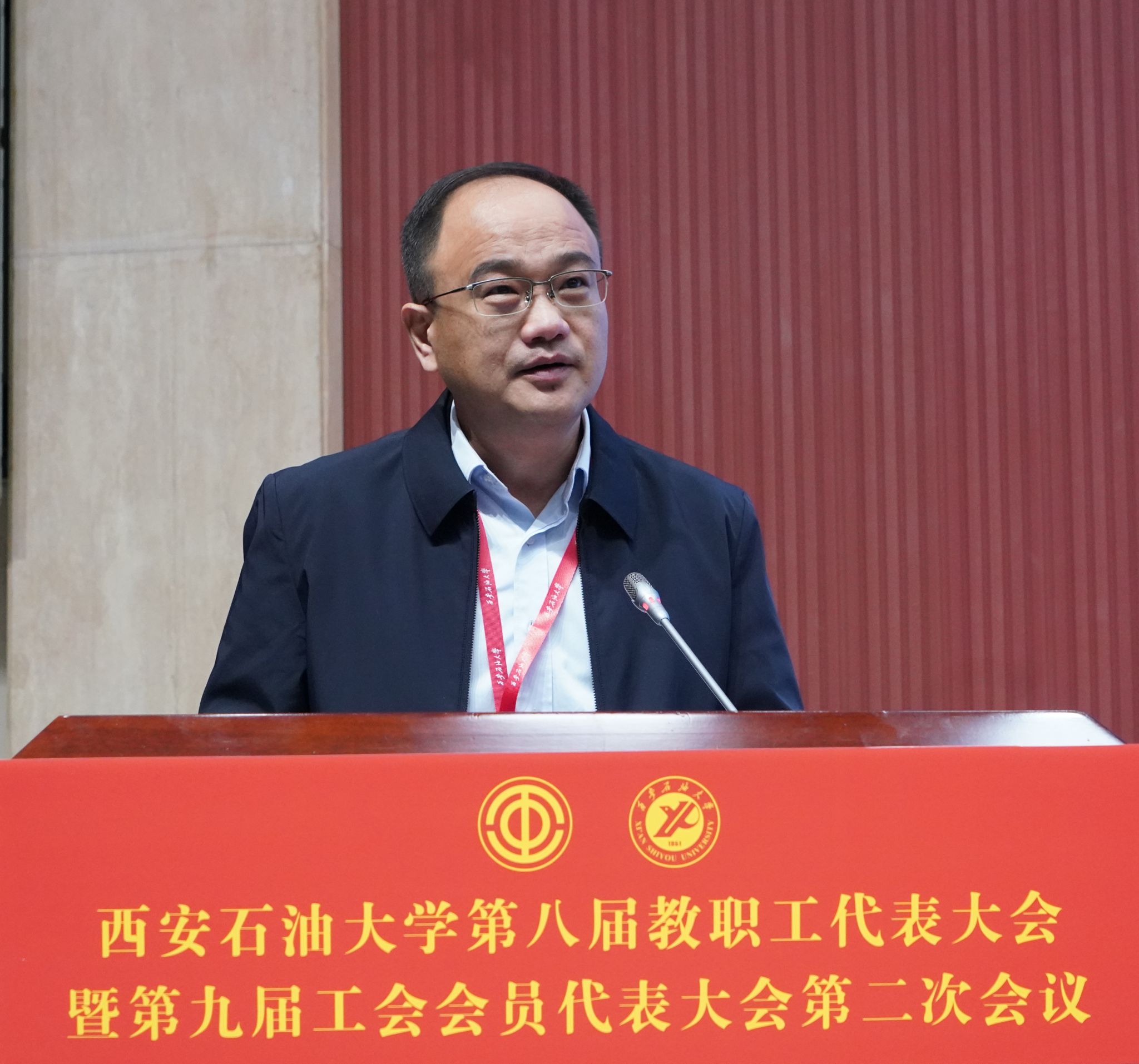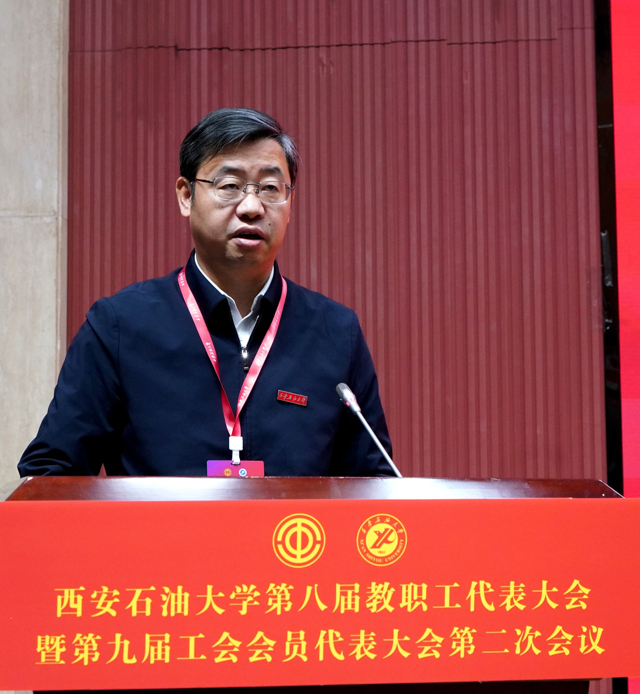 校長(zhǎng)王進(jìn)富作了《與歲功同輝以啟程,攜新程共遠(yuǎn)而擘畫(huà)——年度報(bào)告暨“十五五”規(guī)劃思考》的工作報(bào)告,他指出,本次教代會(huì)是在學(xué)?!笆奈濉睕_刺收官的決勝之年,也是“十五五”謀篇布局的起勢(shì)之年召開(kāi)的一次重要會(huì)議,更是全面深化教育科技人才一體改革促進(jìn)高質(zhì)量發(fā)展的一次會(huì)議。報(bào)告從建設(shè)“三個(gè)西石大”的目標(biāo)出發(fā),全面回顧總結(jié)了2025年我校所取得的成就,并指出2025年全校上下緊扣 “學(xué)科達(dá)標(biāo)年、人才提升年、改革創(chuàng)新年” 主線(xiàn),扎實(shí)推進(jìn) “六大行動(dòng)”,各項(xiàng)事業(yè)呈現(xiàn)出穩(wěn)中有進(jìn)、持續(xù)向好的發(fā)展態(tài)勢(shì)。特別是2024年以來(lái),全校爭(zhēng)做行動(dòng)派、跑出加速度,在學(xué)科突破、科創(chuàng)增長(zhǎng)、人才匯聚等方面實(shí)現(xiàn)多項(xiàng)新突破,為 2026 年發(fā)展積累了寶貴經(jīng)驗(yàn)、奠定了堅(jiān)實(shí)基礎(chǔ)。報(bào)告精準(zhǔn)分析當(dāng)前發(fā)展形勢(shì),對(duì)照教育強(qiáng)國(guó)建設(shè)要求、行業(yè)轉(zhuǎn)型發(fā)展需要、師生校友殷切期盼,科學(xué)部署2026 年及今后一個(gè)時(shí)期的重點(diǎn)任務(wù),為學(xué)校朝著特色鮮明的高水平教學(xué)研究型大學(xué)目標(biāo)邁進(jìn)凝聚起磅礴力量。