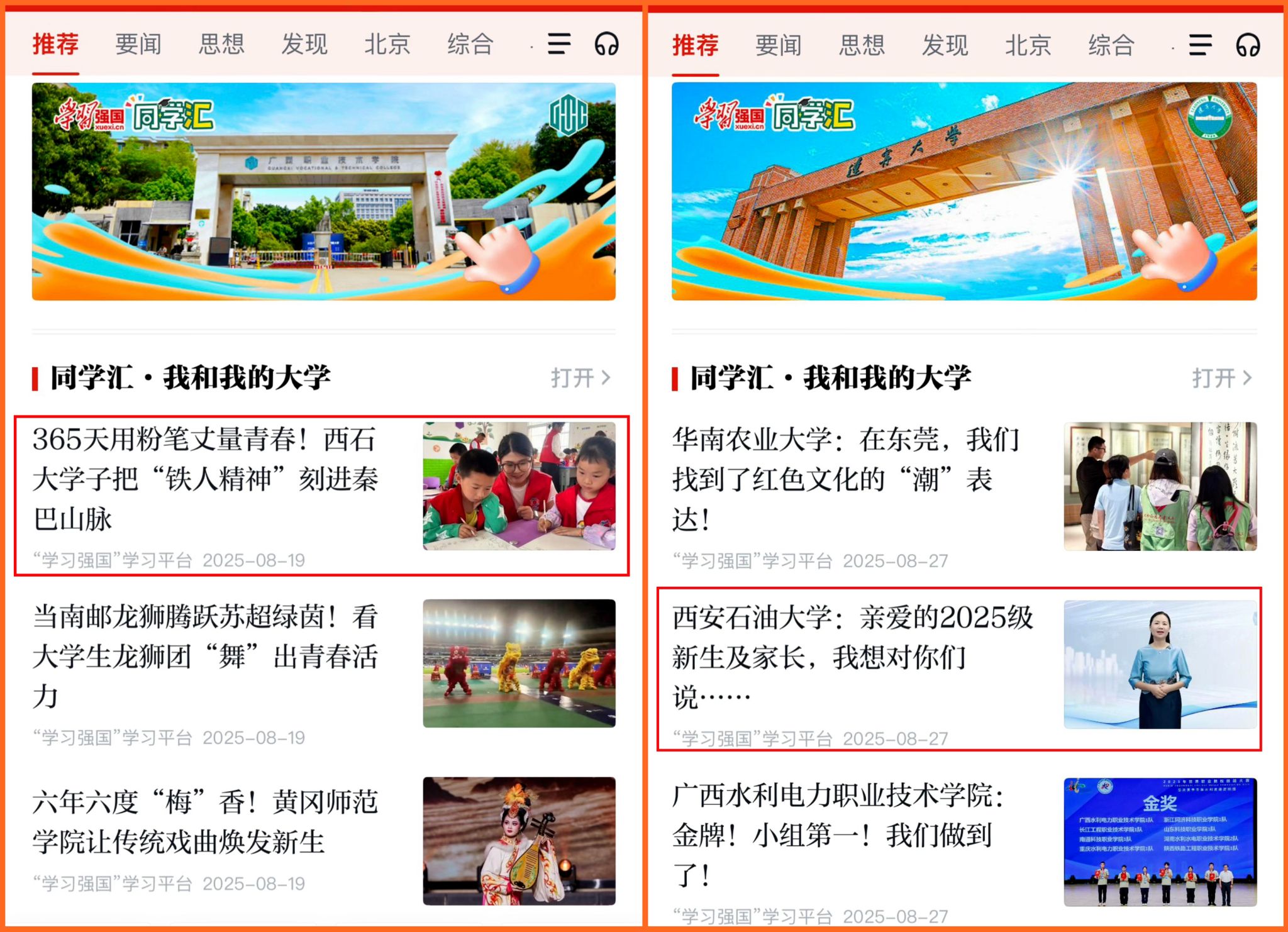 “同學(xué)匯”是“學(xué)習(xí)強(qiáng)國(guó)”學(xué)習(xí)平臺(tái)為貫徹落實(shí)習(xí)近平總書記關(guān)于加強(qiáng)和改進(jìn)高校思想政治工作的重要論述,面向高校、服務(wù)大學(xué)生而研發(fā)的一款主流融媒體產(chǎn)品,支持高校發(fā)布圖文、短視頻等多種形式內(nèi)容。2025年以來(lái),“西安石油大學(xué):祝你高考落筆生花,共赴能源報(bào)國(guó)夢(mèng)”“西安石油大學(xué)學(xué)子暑假在干嘛?看這里”“365天用粉筆丈量青春!西石大學(xué)子把‘鐵人精神’刻進(jìn)秦巴山脈”“西安石油大學(xué):親愛(ài)的2025級(jí)新生及家長(zhǎng),我想對(duì)你們說(shuō)……”等內(nèi)容多次獲得“學(xué)習(xí)強(qiáng)國(guó)”學(xué)習(xí)平臺(tái)“推薦”頻道相關(guān)欄目首頁(yè)推薦。學(xué)校11次上榜一月一期的“學(xué)習(xí)強(qiáng)國(guó)”同學(xué)匯高校榜,進(jìn)一步提高了學(xué)校的影響力和美譽(yù)度。