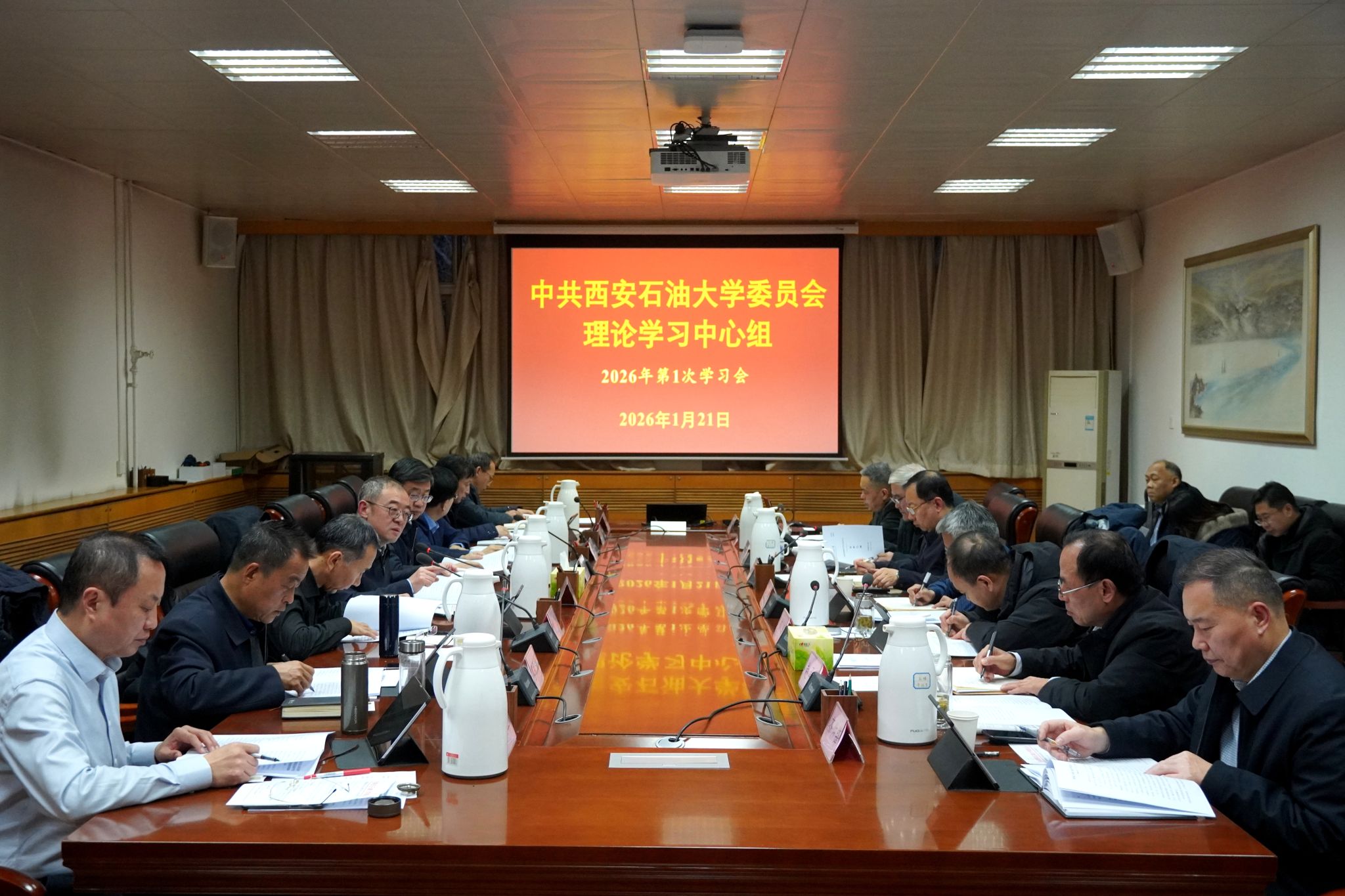 1月21日下午,校黨委理論學(xué)習(xí)中心組2026年第1次學(xué)習(xí)會(huì)在雁塔校區(qū)辦公樓五樓會(huì)議室召開,深入學(xué)習(xí)領(lǐng)會(huì)習(xí)近平總書記在中共中央政治局民主生活會(huì)、在二十屆中央紀(jì)委五次全會(huì)上的重要講話精神,集體學(xué)習(xí)習(xí)近平主席2026年新年賀詞,學(xué)習(xí)傳達(dá)中央及省委關(guān)于開好2025年度民主生活會(huì)的相關(guān)通知文件,專題學(xué)習(xí)習(xí)近平總書記《學(xué)習(xí)好貫徹好黨的二十屆四中全會(huì)精神》重要文章、《習(xí)近平關(guān)于社會(huì)主義文化建設(shè)論述摘編》節(jié)選內(nèi)容,并圍繞校級(jí)黨員領(lǐng)導(dǎo)人員民主生活會(huì)主題開展專題研討。校黨委書記常江主持并講話,校黨委理論學(xué)習(xí)中心組成員參加會(huì)議。