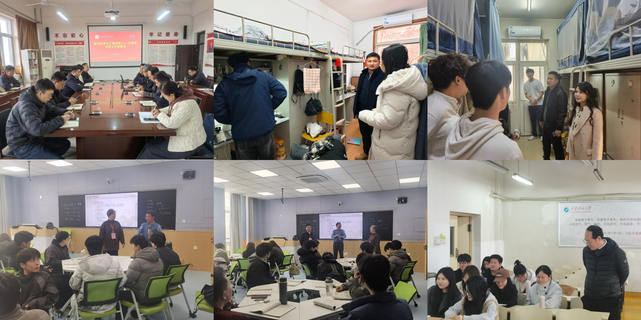 地球科學(xué)與工程學(xué)院以保障開學(xué)工作有序推進(jìn)為目標(biāo),3月2日召開新學(xué)期工作部署會(huì),對(duì)學(xué)院新學(xué)期各項(xiàng)工作進(jìn)行再動(dòng)員、再部署。學(xué)院領(lǐng)導(dǎo)班子深入學(xué)生宿舍、教室、實(shí)驗(yàn)室和職工之家,實(shí)地了解教師上課狀況,檢查學(xué)生返校報(bào)到、課堂出勤與學(xué)習(xí)狀態(tài),聽取師生意見建議,全面了解新學(xué)期開學(xué)運(yùn)行情況,確保教學(xué)秩序平穩(wěn)有序。3月4日學(xué)院全體學(xué)工干部會(huì)上,就隊(duì)伍作風(fēng)建設(shè)、學(xué)生思想教育、校園安全穩(wěn)定、學(xué)生就業(yè)考研、企業(yè)導(dǎo)師聘任及深入宿舍和課堂等工作作了強(qiáng)調(diào)和要求,輔導(dǎo)員通過組織學(xué)生簽到、深入課堂和宿舍等方式,了解學(xué)生思想情況和上課狀態(tài),結(jié)合上學(xué)期成績(jī)狀況,有針對(duì)性地開展教育引導(dǎo);走訪過程中,畢業(yè)班輔導(dǎo)員結(jié)合個(gè)人發(fā)展意愿與當(dāng)前就業(yè)形勢(shì),并就崗位信息對(duì)接等方面提出指導(dǎo)建議,切實(shí)助力畢業(yè)生實(shí)現(xiàn)高質(zhì)量就業(yè)。各年級(jí)通過召開年級(jí)大會(huì)、主題班會(huì)等形式,開展內(nèi)容豐富、形式多樣的主題教育活動(dòng)。本科生導(dǎo)師面對(duì)面交流、企業(yè)導(dǎo)師聘任等工作有序推進(jìn)、落地見效。學(xué)生參與學(xué)科競(jìng)賽熱情高漲,學(xué)院整體育人工作氛圍濃厚向上。