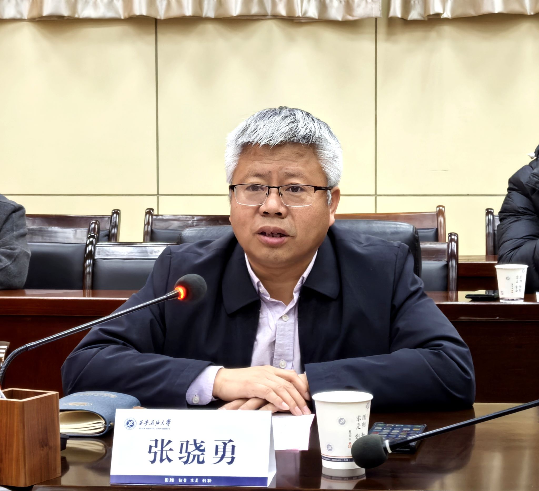 張驍勇在致辭中對(duì)金哲一行的到來表示歡迎,并簡要介紹了學(xué)校的發(fā)展歷程、學(xué)科特色及科研優(yōu)勢(shì)。他強(qiáng)調(diào),學(xué)校始終堅(jiān)持以服務(wù)行業(yè)需求為導(dǎo)向,期待與企業(yè)在新能源、機(jī)械工程等領(lǐng)域深化合作,推動(dòng)產(chǎn)學(xué)研深度融合。