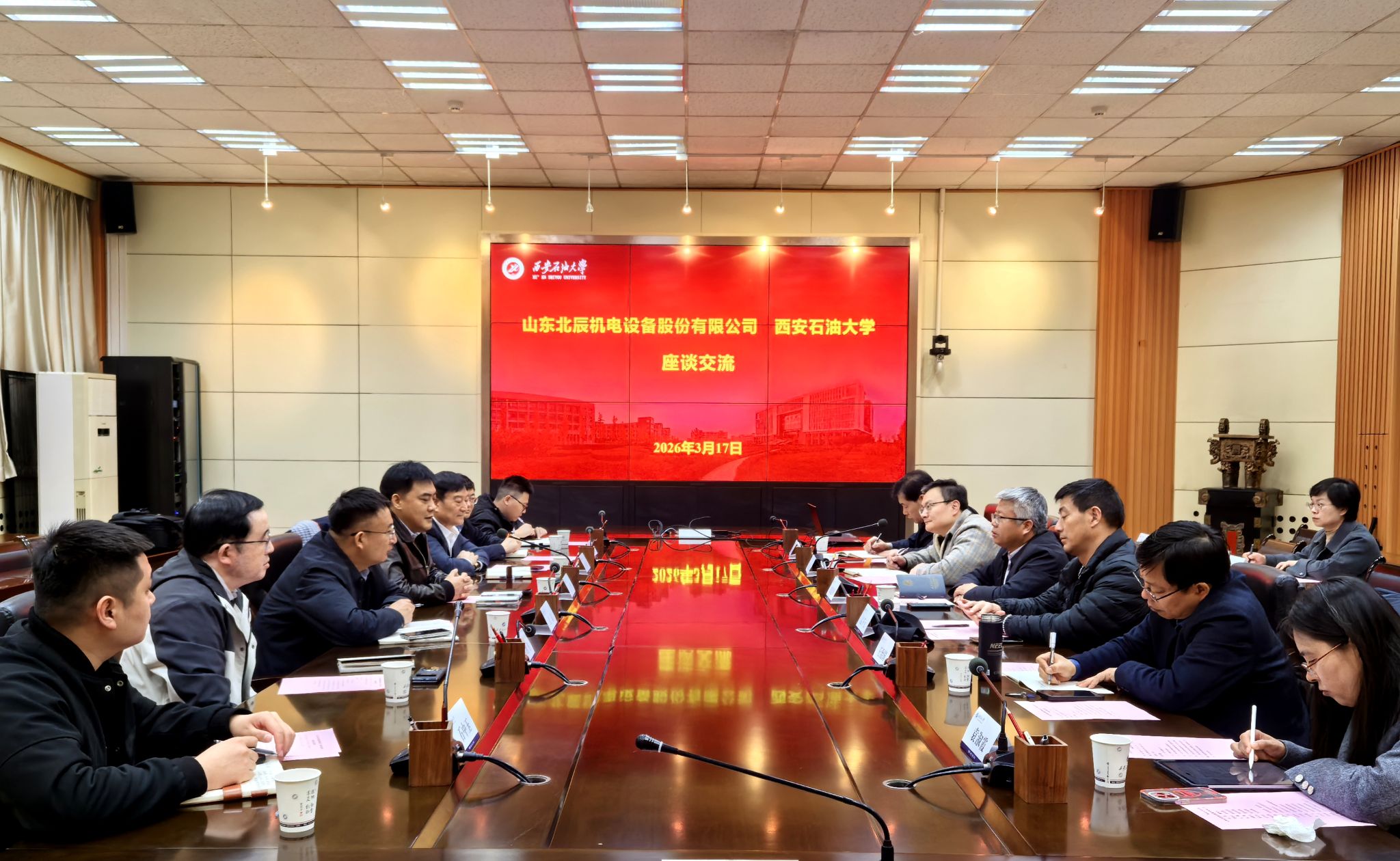 3月17日上午,山東北辰機(jī)電設(shè)備股份有限公司董事長金哲、總經(jīng)理唐金山一行來我校交流座談,會(huì)議在雁塔校區(qū)會(huì)議中心第二會(huì)議室召開。我校副校長張驍勇出席座談會(huì),會(huì)議由科研處副處長屈樂主持。