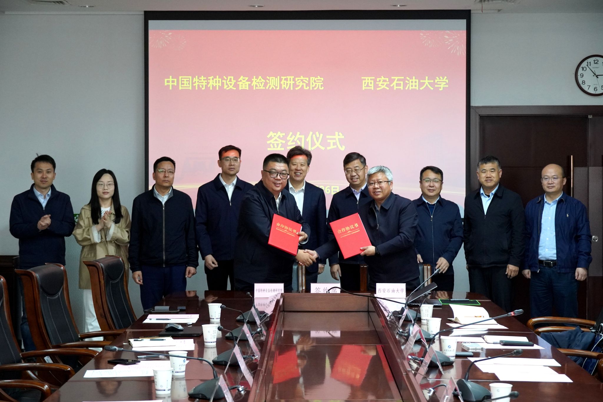 會上,雙方代表簽署了合作協議。中國特種設備檢測研究院副院長竇文宇與我校副校長張驍勇分別代表雙方簽署協議,王軍、王進富共同見證簽約。