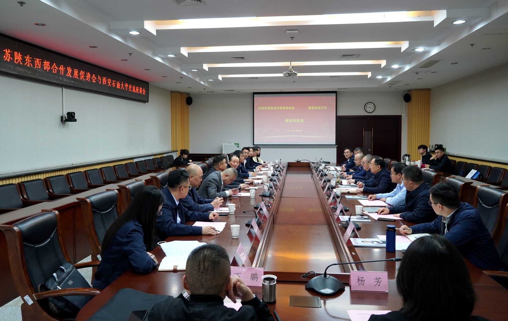 中鐵八局、海南柏濤投資有限公司、誠邁科技股份有限公司、江蘇農(nóng)墾瑞遠(yuǎn)集團(tuán)、西安市陶行知研究院、陜西省校友經(jīng)濟(jì)科技促進(jìn)會、江蘇明浩科教集團(tuán)公司、江蘇未來網(wǎng)絡(luò)集團(tuán)、神木溪鎂荃吉康科技有限公司,我校學(xué)生工作處、科研處、研究生院、校友工作與合作交流處、計(jì)算機(jī)學(xué)院、管道工程學(xué)院、繼續(xù)教育學(xué)院等單位負(fù)責(zé)人參加座談。