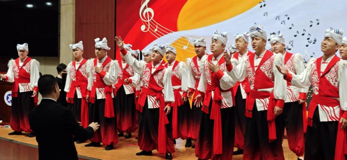 音樂會下半場,施萊格與鮑姆帶來《溫柔的夢》《去吧,幸運的玫瑰》等五首貝利尼藝術歌曲,完美展現(xiàn)意大利藝術歌曲的浪漫與深情。緊接著,我校男聲合唱團在李強教授指揮下,演唱改編自陜北民歌的《神仙擋不住人想人》《可想你哩》,蒼涼熾熱的信天游旋律與黃河岸邊的深情詠嘆,深深打動現(xiàn)場每一位觀眾。