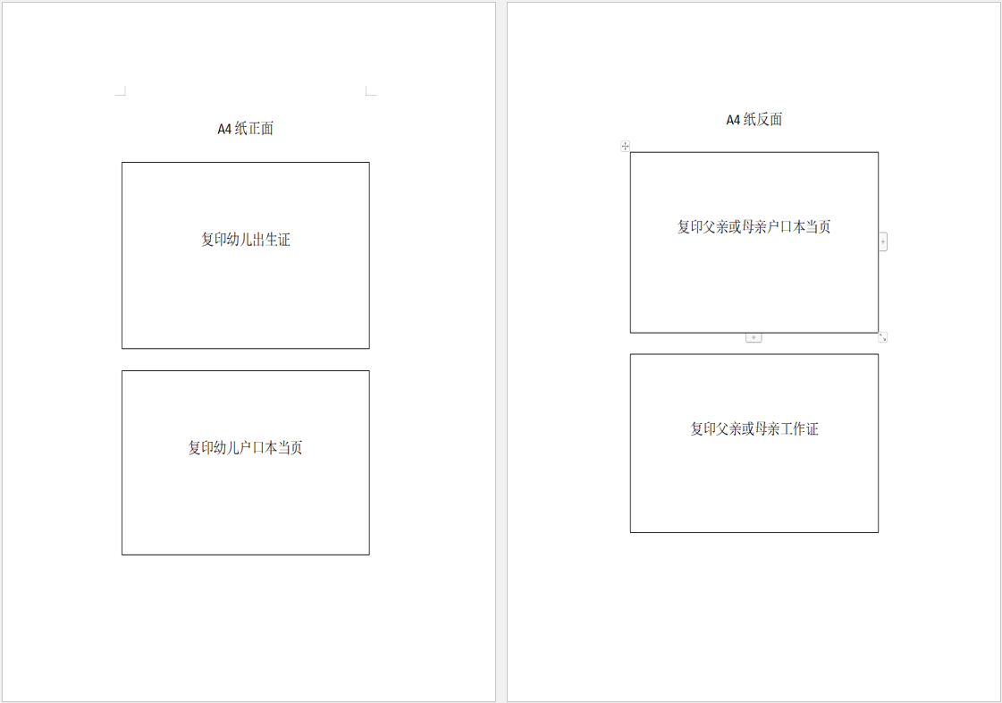 辦理入園手續(xù)時,家長需攜幼兒出生證明原件及復印件、幼兒戶口本當頁復印件、父親或母親戶口本當頁復印件、父親或母親本人工作證復印件(以上資料請?zhí)崆笆褂肁4紙依次進行雙面復印,復印模板附后)。