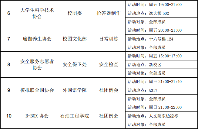 西安石油大學(xué)2016—2017學(xué)年第二學(xué)期第九周社團(tuán)活動(dòng)一覽表