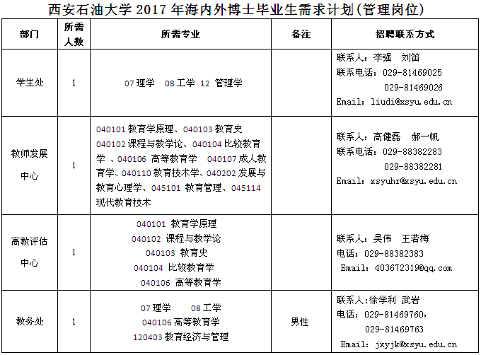 西安石油大學(xué)2017年海內(nèi)外博士畢業(yè)生需求計(jì)劃(管理崗位)