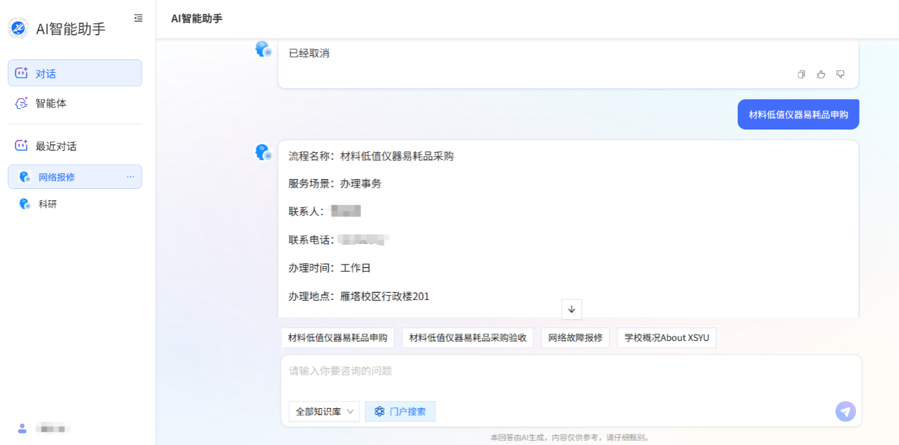 AI小油智能助手:24小時智慧服務新標配。融合服務門戶同步搭載AI小油智能問答系統(tǒng),聚焦獎助政策、辦事流程、校園網(wǎng)絡等高頻咨詢場景,提供7×24小時即時響應服務。